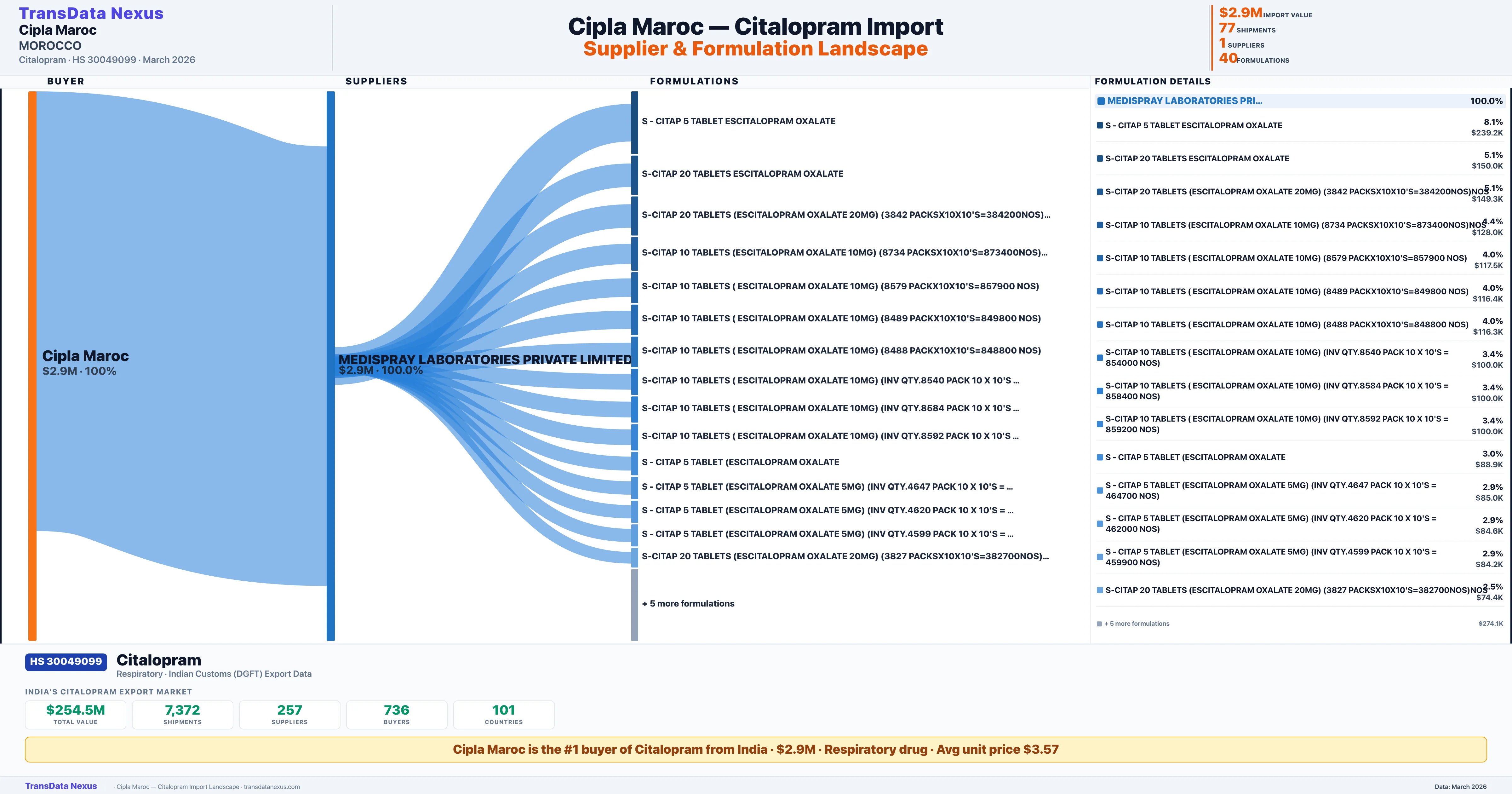 CIPLA MAROC sources Citalopram from 1 verified Indian supplier: MEDISPRAY LABORATORIES PRIVATE LIMITED ($2.9M, 100.0%). This is based on 77 customs records.