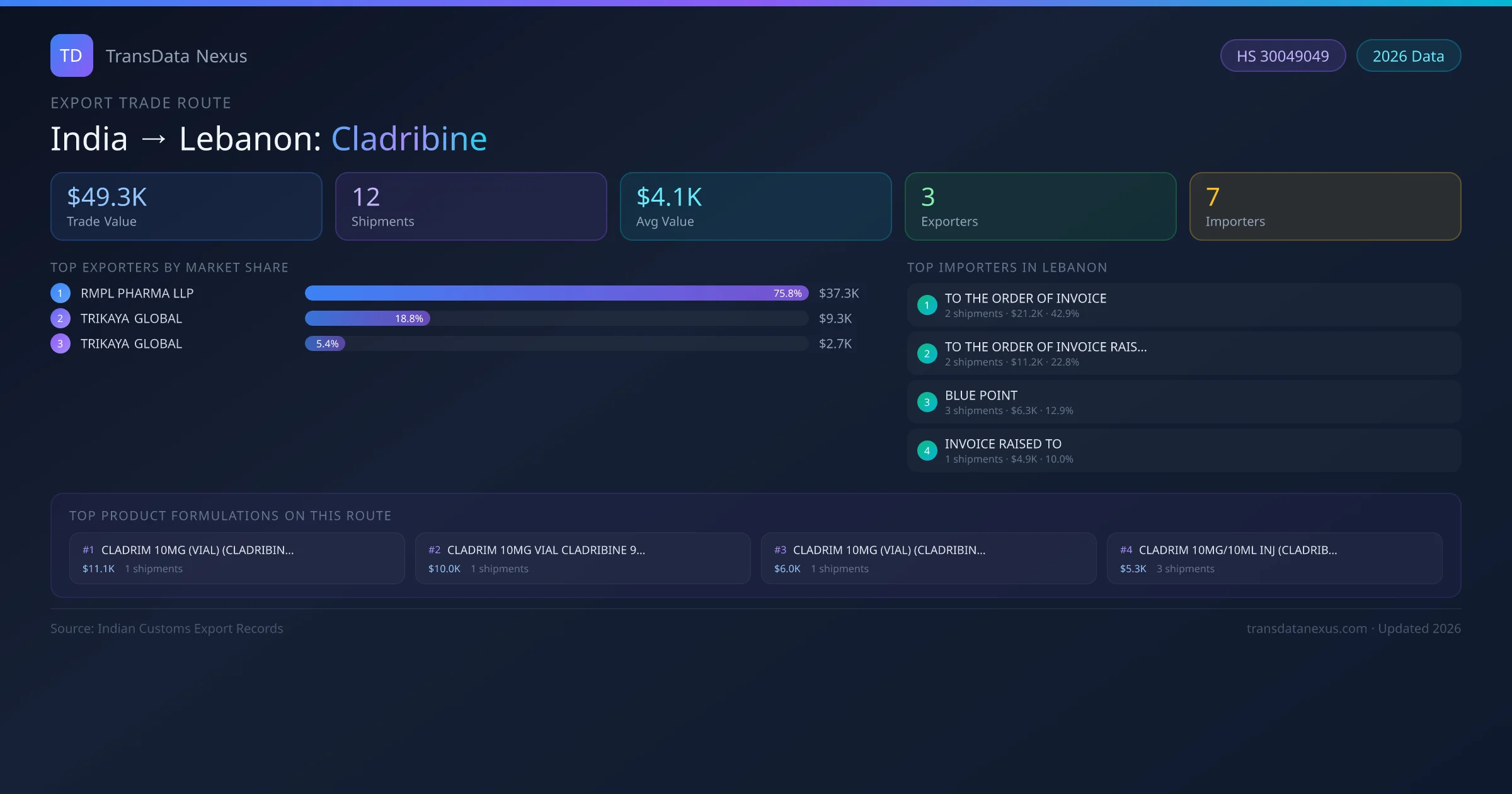 The India to Lebanon Cladribine corridor is one of India's established pharmaceutical export routes, with 12 shipments documented worth a combined $49.3K USD. The route is dominated by RMPL PHARMA LLP, which alone accounts for roughly 76% of all export value, reflecting the consolidated nature of India's cladribine manufacturing sector.