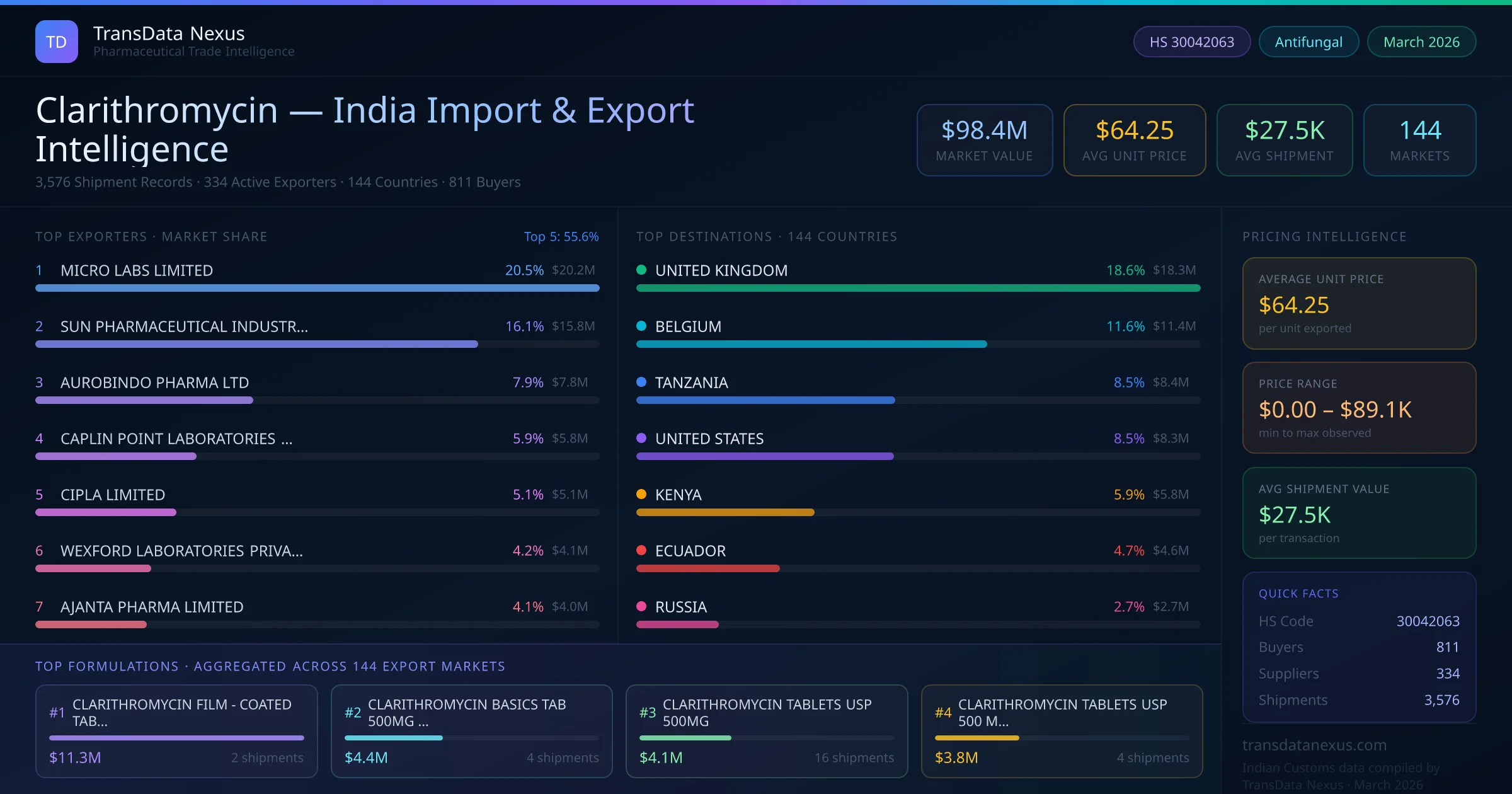 Between 2022 and 2026, India exported $98.4M worth of clarithromycin across 3,576 verified shipments to 144 countries — covering 74% of world markets in the Antibiotics segment. The largest destination is UNITED KINGDOM (18.6%). MICRO LABS LIMITED leads with a 20.5% share. All figures are drawn from Indian Customs (DGFT) shipping bill records spanning four years of trade activity.