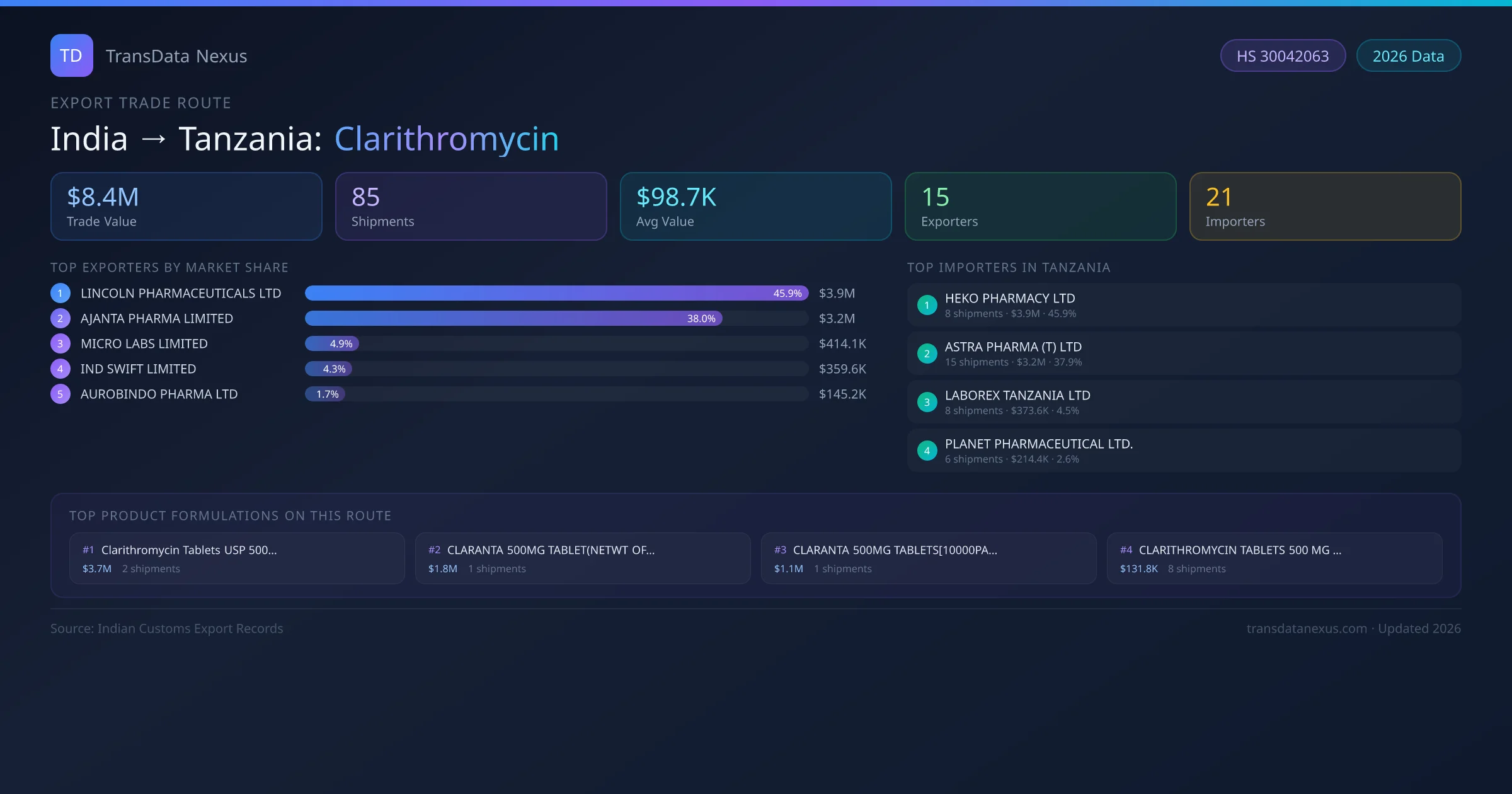 - 1.Route Identification: India to Tanzania export trade corridor identified from Indian Customs (DGFT) records for Clarithromycin.