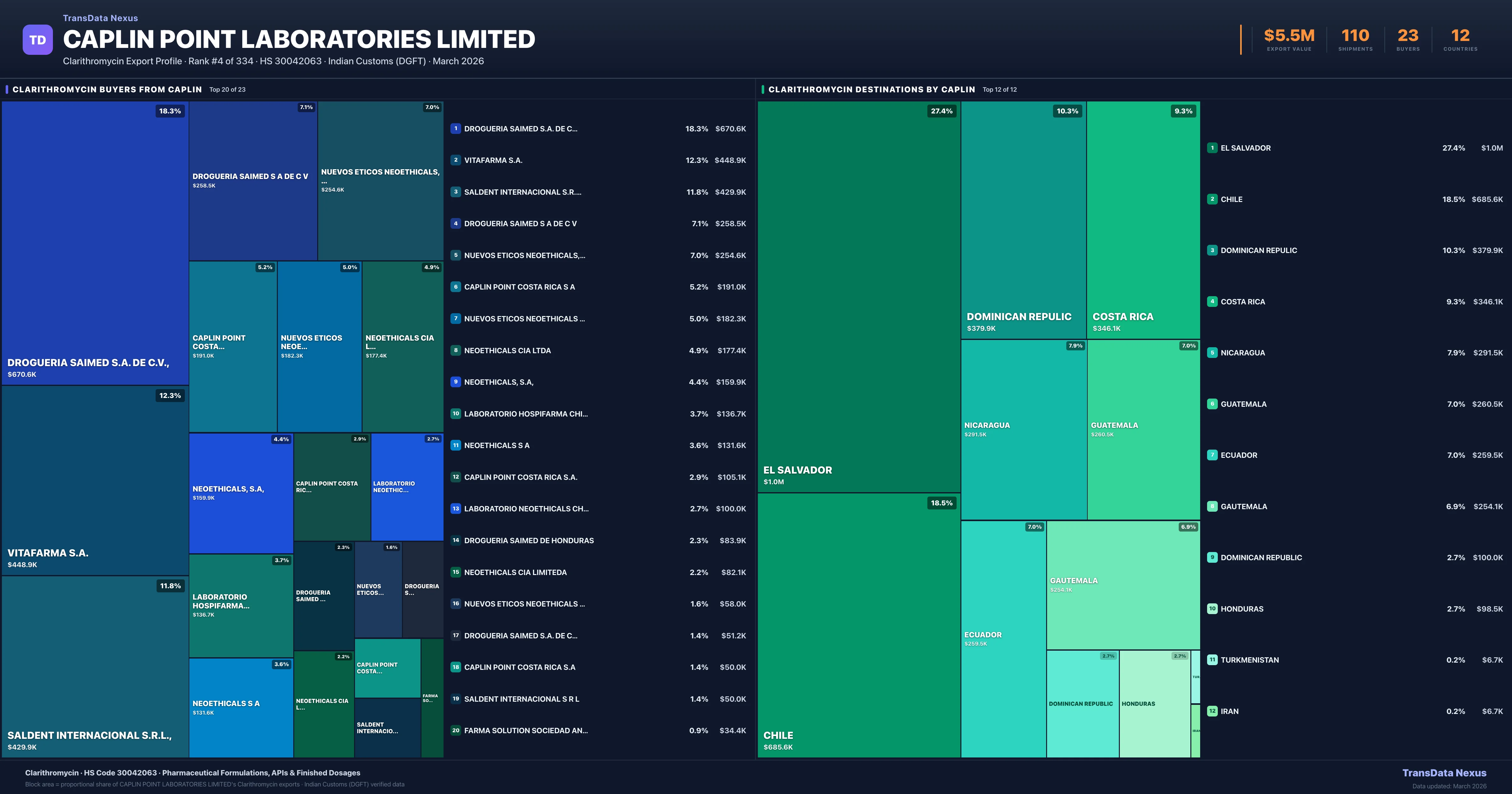 Caplin Point Laboratories Limited supplies Clarithromycin to 23 buyers globally. The largest buyer is DROGUERIA SAIMED S.A. DE C.V., (EL SALVADOR), followed by VITAFARMA S.A. (CHILE) and SALDENT INTERNACIONAL S.R.L., (DOMINICAN REPULIC). These buyers represent pharmaceutical distributors, hospital groups, and government procurement agencies in their respective markets.