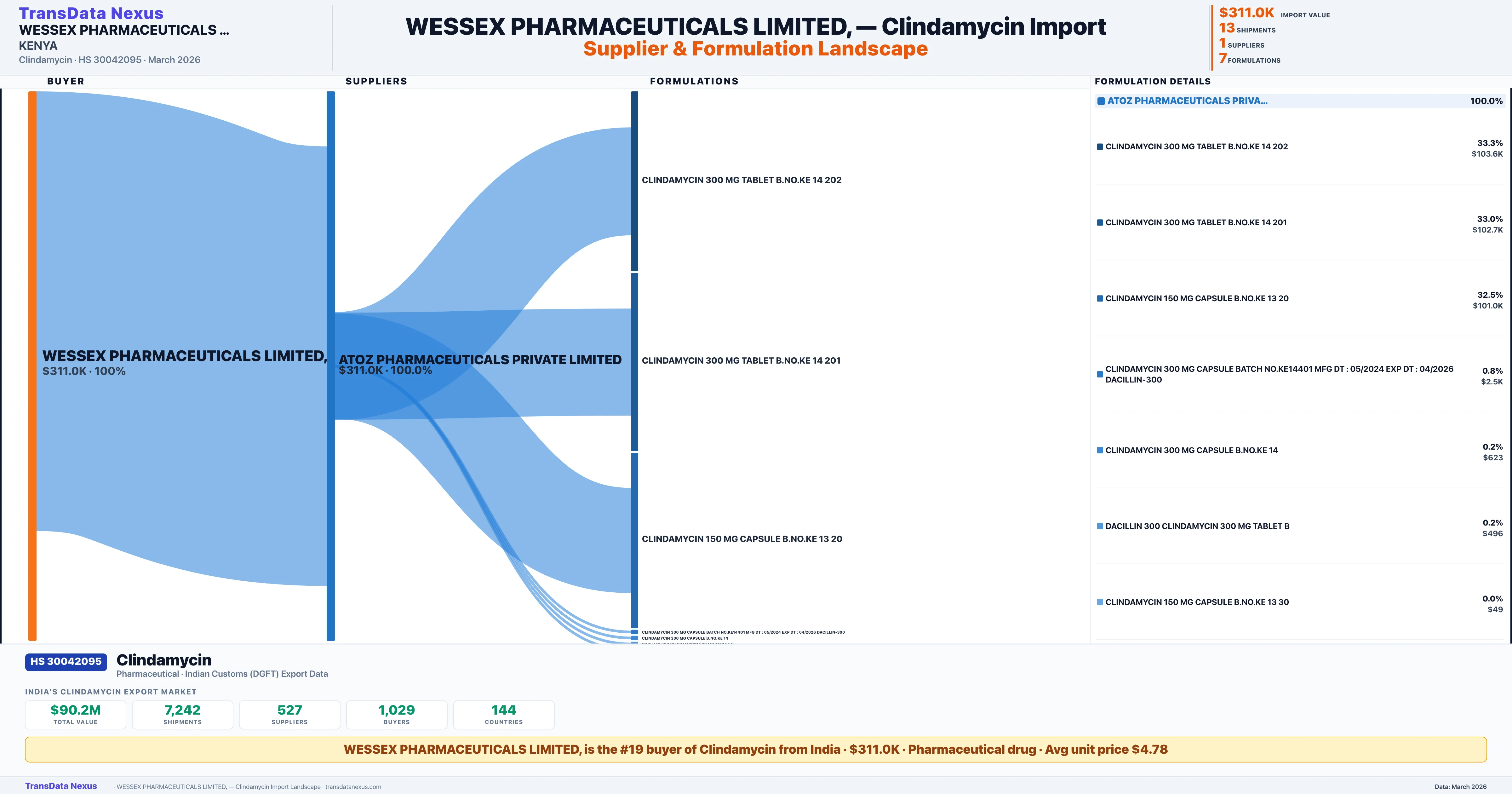 WESSEX PHARMACEUTICALS LIMITED, sources Clindamycin from 1 verified Indian supplier based on 13 customs records. The primary supplier is ATOZ PHARMACEUTICALS PRIVATE LIMITED accounting for 100.0% of imports.