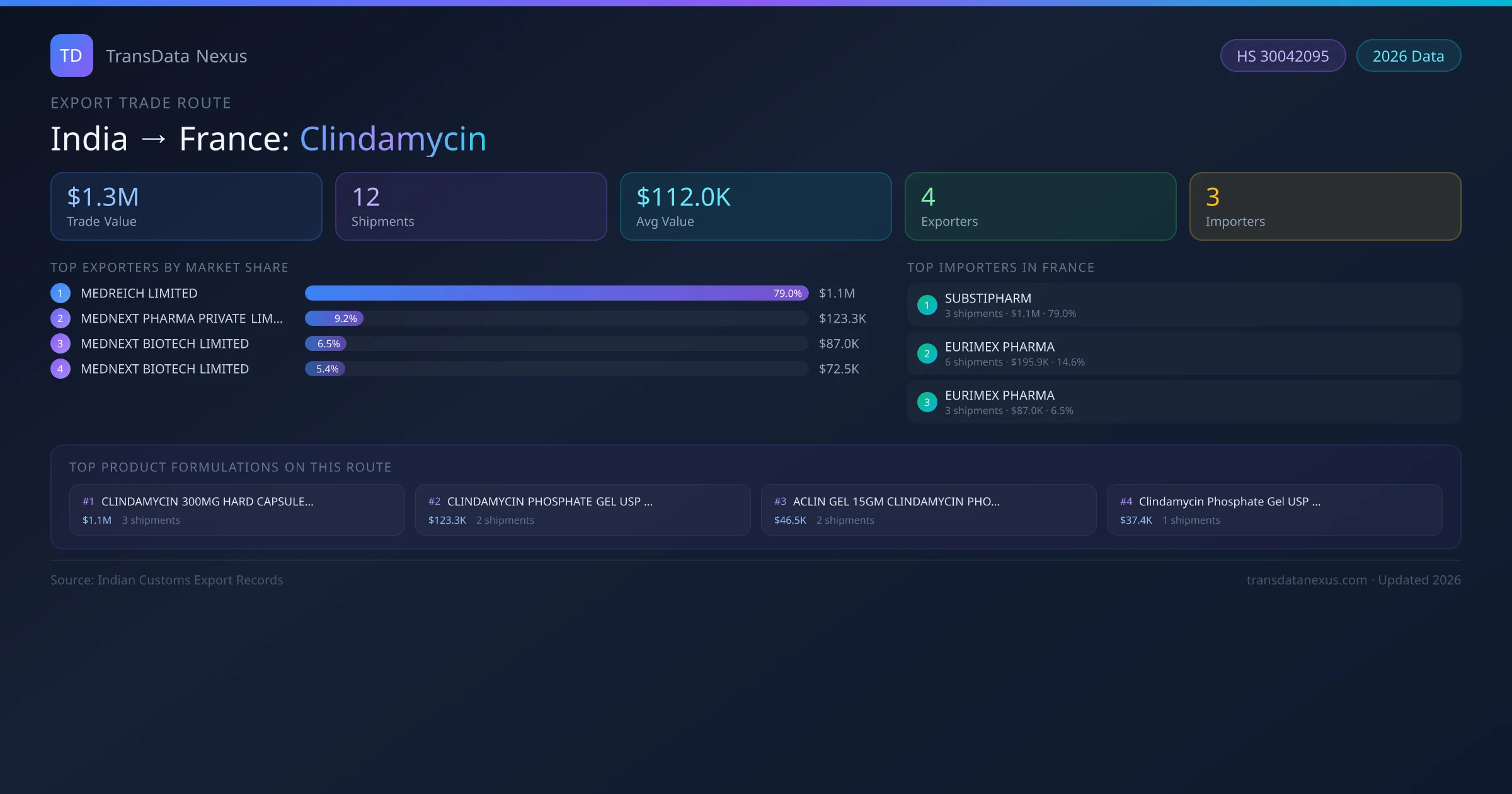 - 1.Route Identification: India to France export trade corridor identified from Indian Customs (DGFT) records for Clindamycin.