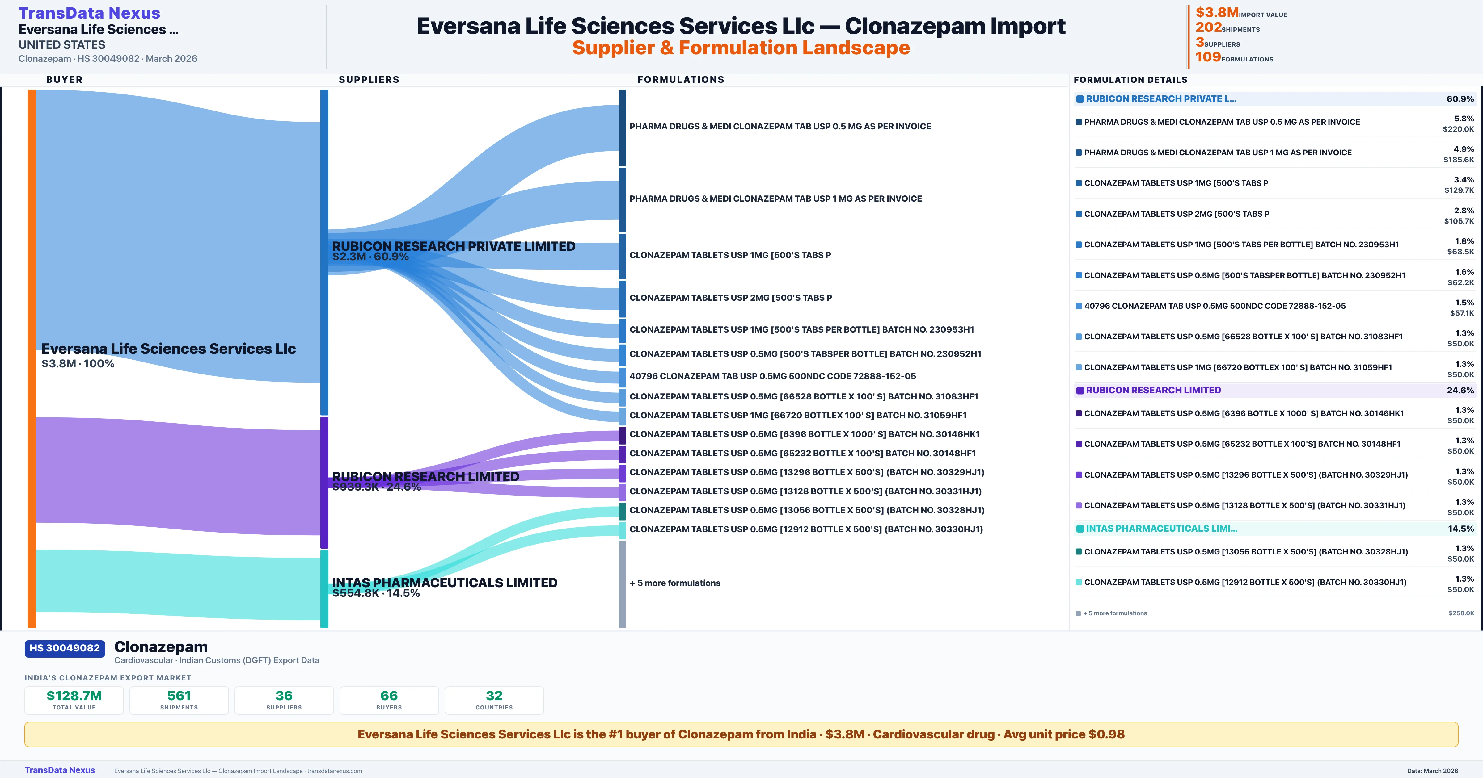 EVERSANA LIFE SCIENCES SERVICES LLC sources Clonazepam from 3 verified Indian suppliers based on 202 customs records. The primary supplier is RUBICON RESEARCH PRIVATE LIMITED accounting for 60.9% of imports.