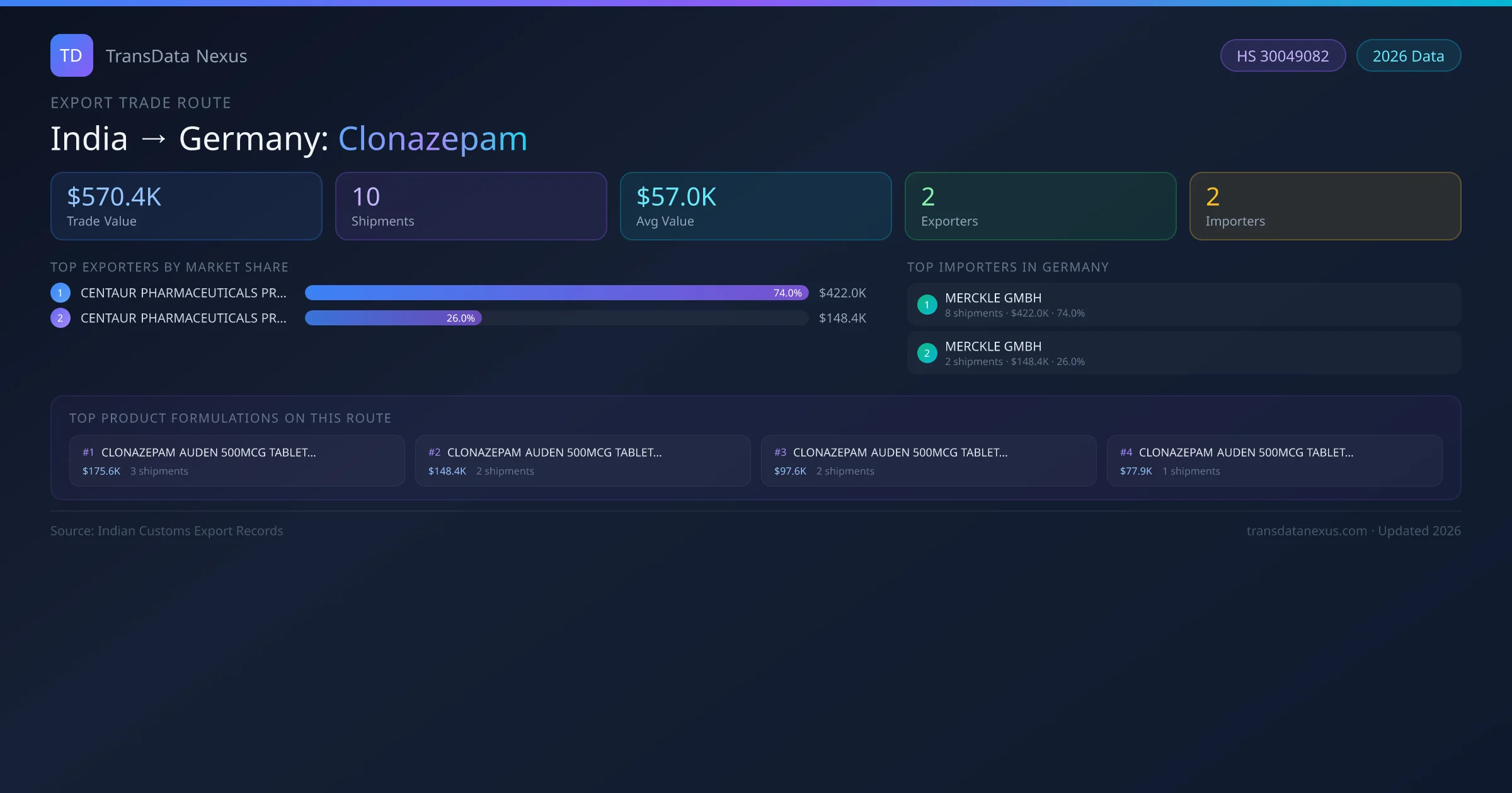 The India to Germany Clonazepam corridor is one of India's established pharmaceutical export routes, with 10 shipments documented worth a combined $570.4K USD. The route is dominated by CENTAUR PHARMACEUTICALS PRIVATE LIMITED, which alone accounts for roughly 74% of all export value, reflecting the consolidated nature of India's clonazepam manufacturing sector.