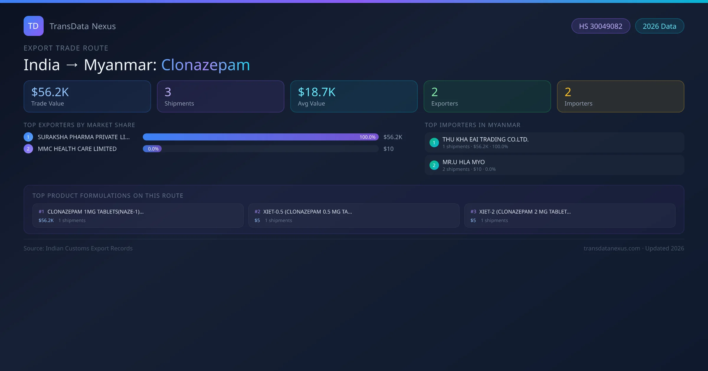 India has recorded 3 verified shipments of Clonazepam exported to Myanmar, representing a combined trade value of $56.2K USD. This corridor is served by 2 active Indian exporters, with an average shipment value of $18.7K USD. The leading Indian exporter is SURAKSHA PHARMA PRIVATE LIMITED, which accounts for 100% of total export value with 1 shipments worth $56.2K USD. On the buying side, THU KHA EAI TRADING CO.LTD. is the largest importer in Myanmar with $56.2K USD in purchases. All data sourced from Indian Customs (DGFT) shipping bill records. Values reported in FOB USD.