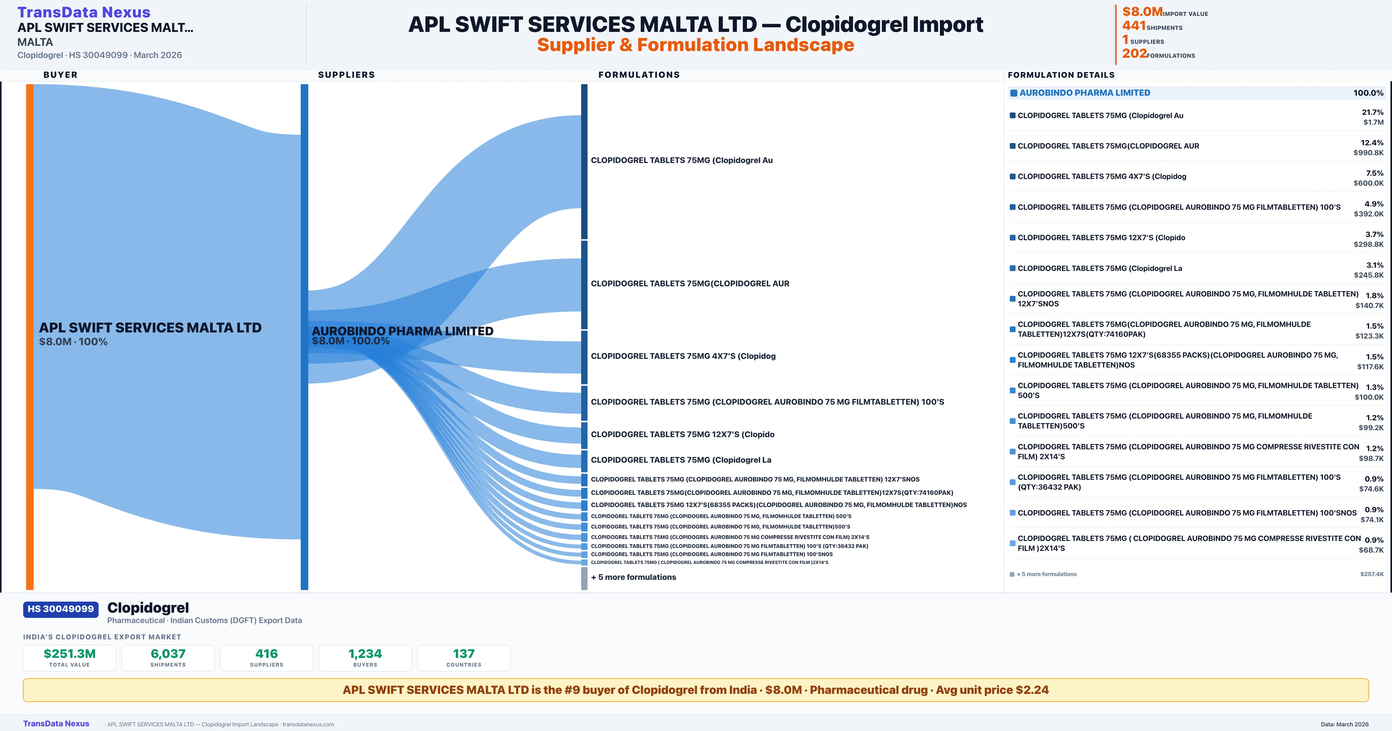 APL SWIFT SERVICES MALTA LTD imports 202 distinct Clopidogrel formulations from India. The top formulation is CLOPIDOGREL TABLETS 75MG (Clopidogrel Au with 55 shipments worth $1.7M.