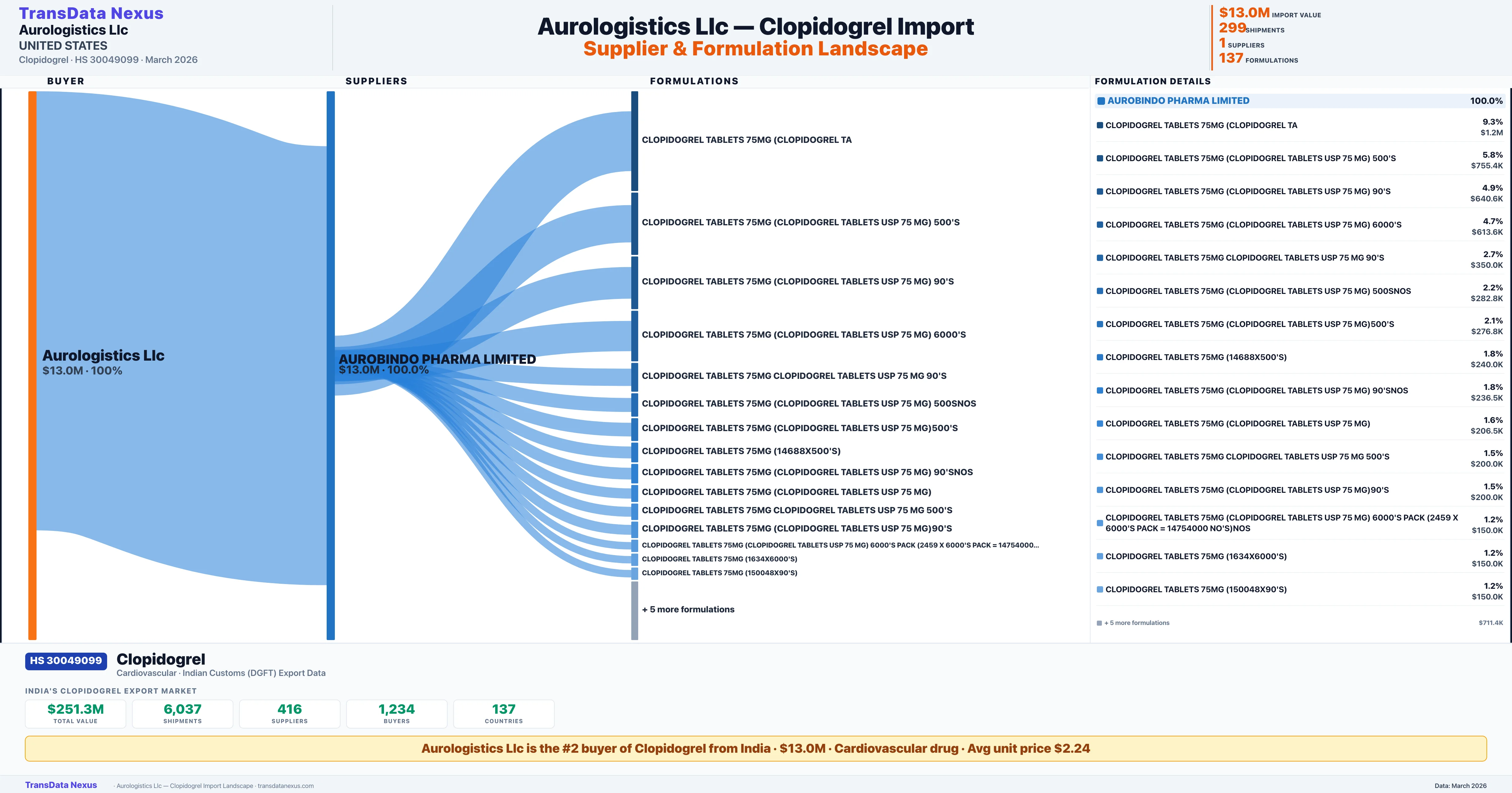AUROLOGISTICS LLC sources Clopidogrel from 1 verified Indian supplier: AUROBINDO PHARMA LIMITED ($13.0M, 100.0%). This is based on 299 customs records.