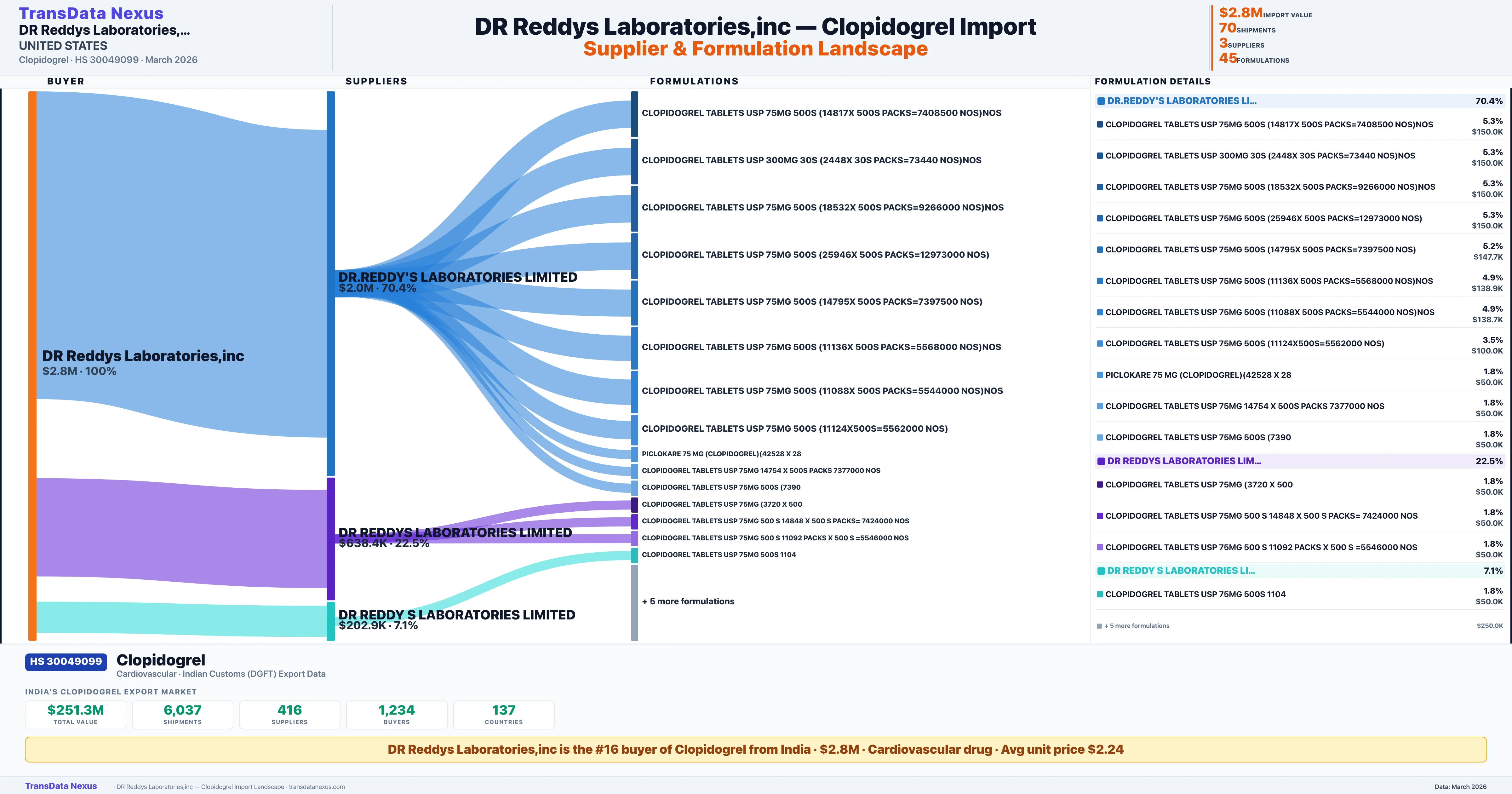 DR REDDYS LABORATORIES INC imports 45 distinct Clopidogrel formulations from India. The top formulation is CLOPIDOGREL TABLETS USP 75MG 500S (14817X 500S PACKS=7408500 with 3 shipments worth $150.0K.