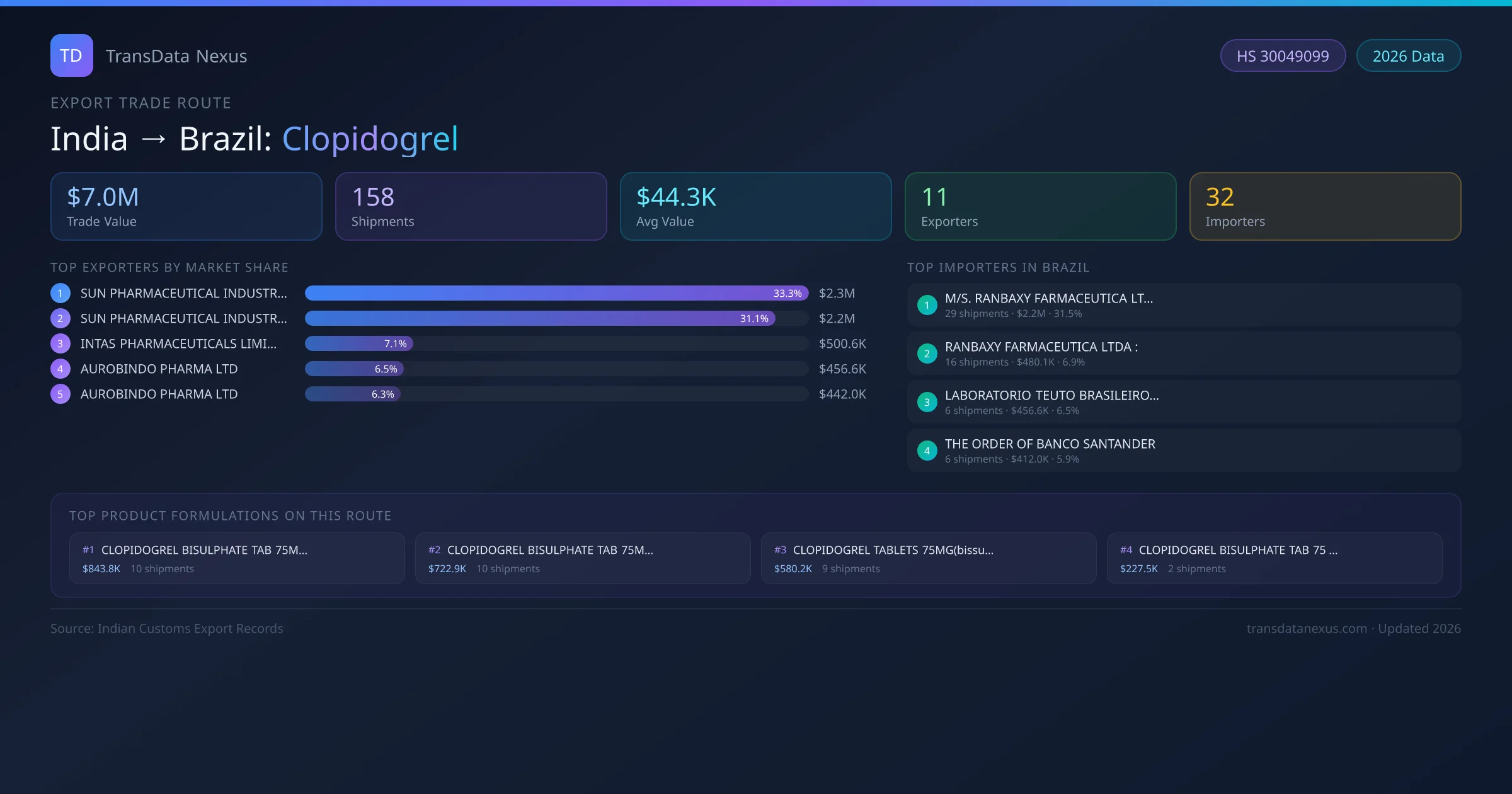 - 1.Route Identification: India to Brazil export trade corridor identified from Indian Customs (DGFT) records for Clopidogrel.