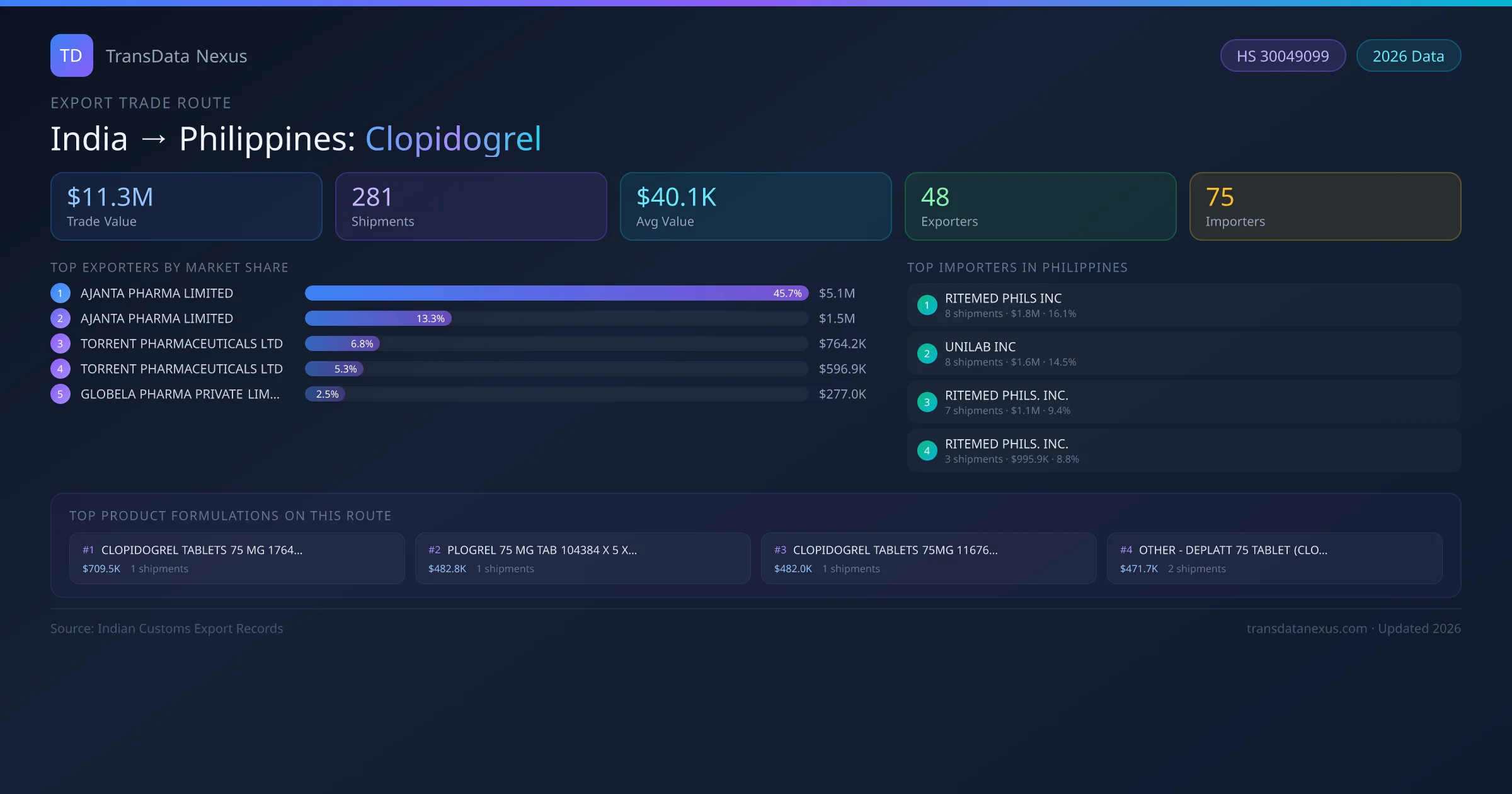 India has recorded 281 verified shipments of Clopidogrel exported to Philippines, representing a combined trade value of $11.3M USD. This corridor is served by 48 active Indian exporters, with an average shipment value of $40.1K USD. The leading Indian exporter is AJANTA PHARMA LIMITED, which accounts for 46% of total export value with 24 shipments worth $5.1M USD. On the buying side, RITEMED PHILS INC is the largest importer in Philippines with $1.8M USD in purchases. The top 3 suppliers — AJANTA PHARMA LIMITED, AJANTA PHARMA LIMITED , TORRENT PHARMACEUTICALS LTD — together control 66% of total trade value on this route. All data sourced from Indian Customs (DGFT) shipping bill records. Values reported in FOB USD.