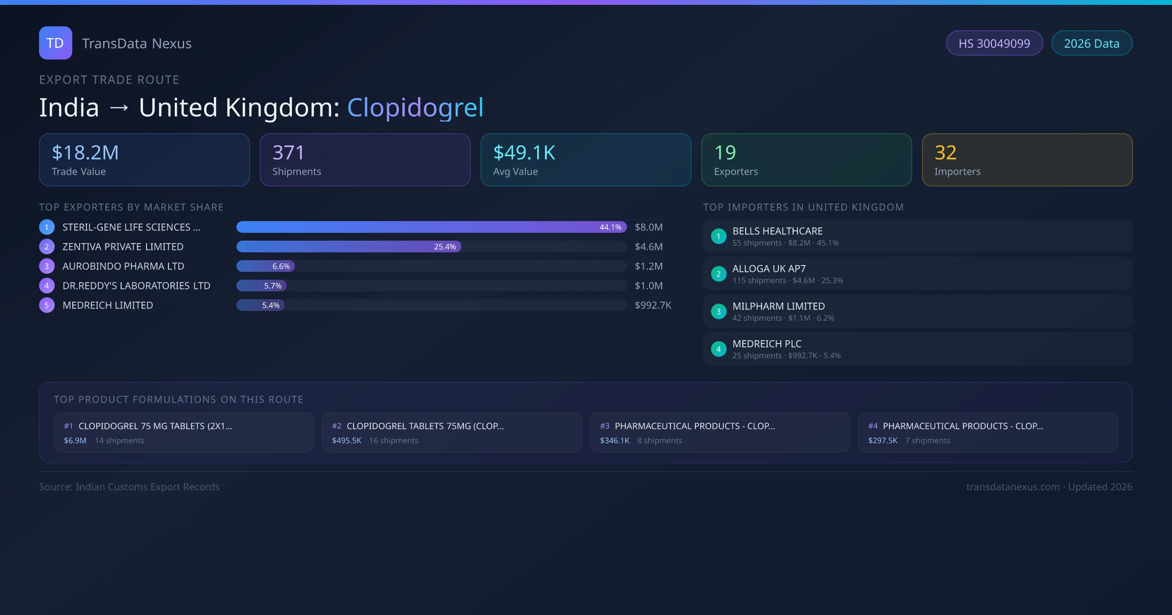 India exports Clopidogrel to United Kingdom worth approximately $18.2M USD across 371 recorded shipments. The average value per shipment is $49.1K USD.
