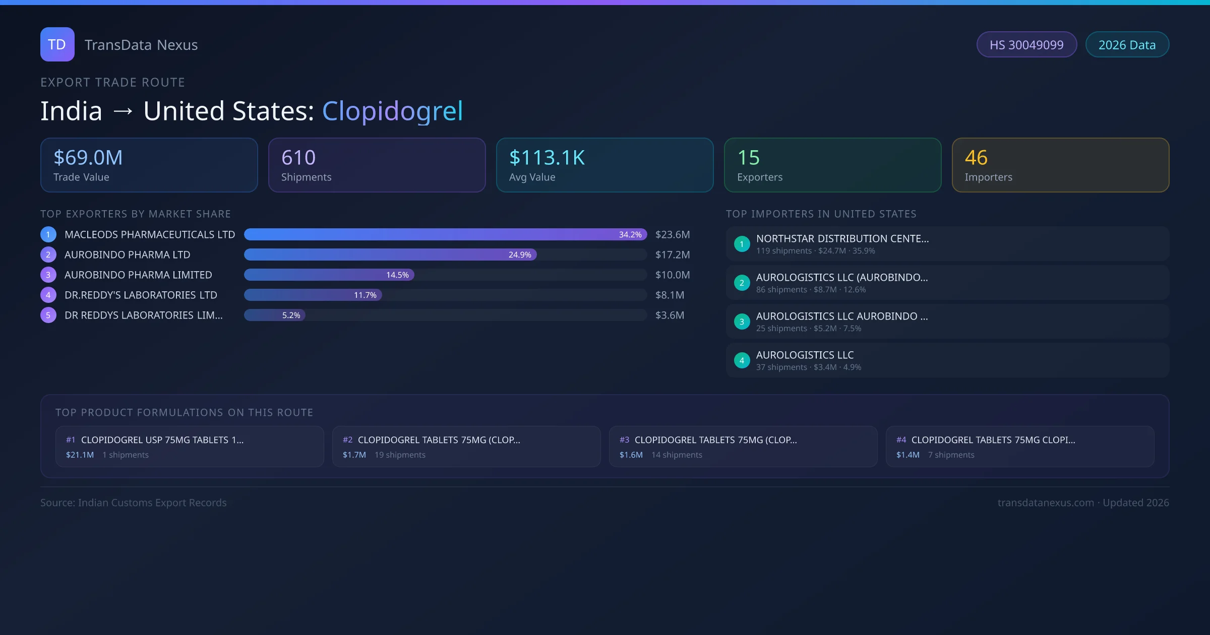 India has recorded 610 verified shipments of Clopidogrel exported to United States, representing a combined trade value of $69.0M USD. This corridor is served by 15 active Indian exporters, with an average shipment value of $113.1K USD. The leading Indian exporter is MACLEODS PHARMACEUTICALS LTD, which accounts for 34% of total export value with 97 shipments worth $23.6M USD. On the buying side, NORTHSTAR DISTRIBUTION CENTER 8912 is the largest importer in United States with $24.7M USD in purchases. The top 3 suppliers — MACLEODS PHARMACEUTICALS LTD, AUROBINDO PHARMA LTD, AUROBINDO PHARMA LIMITED — together control 74% of total trade value on this route. All data sourced from Indian Customs (DGFT) shipping bill records. Values reported in FOB USD.