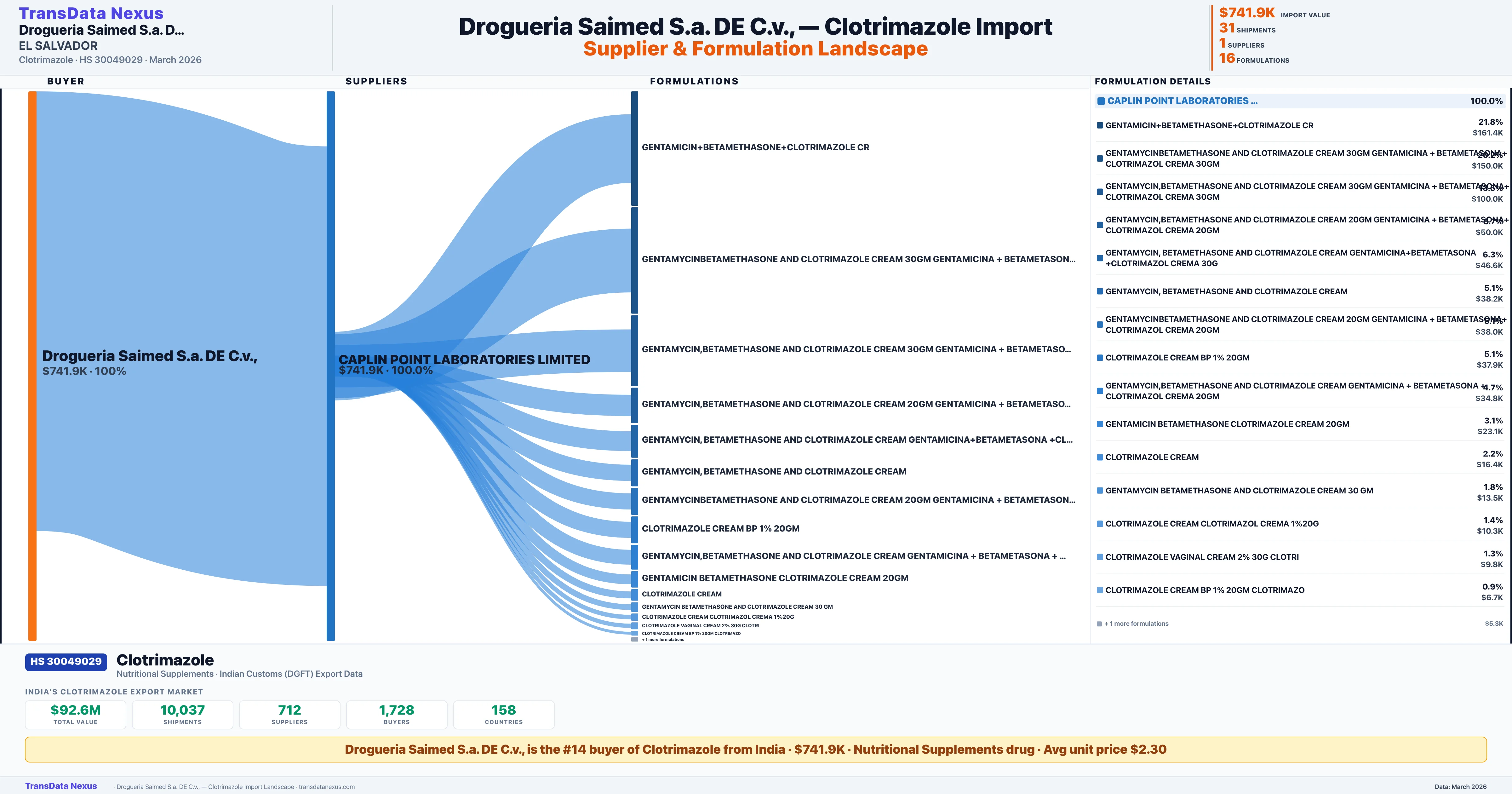 DROGUERIA SAIMED S A DE C V sources Clotrimazole from 1 verified Indian supplier: CAPLIN POINT LABORATORIES LIMITED ($741.9K, 100.0%). This is based on 31 customs records.