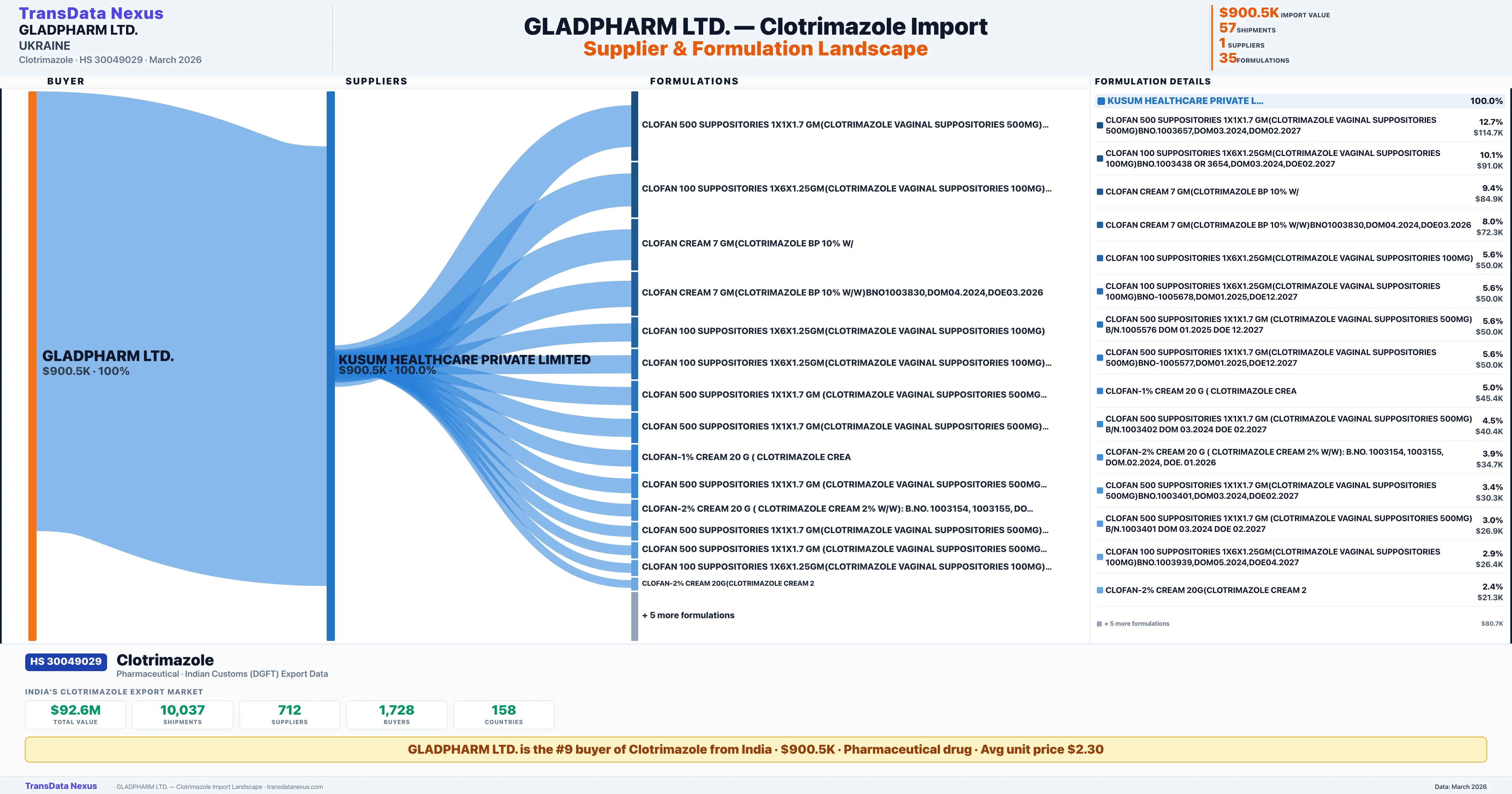 GLADPHARM LTD. sources Clotrimazole from 1 verified Indian supplier: KUSUM HEALTHCARE PRIVATE LIMITED ($900.5K, 100.0%). This is based on 57 customs records.