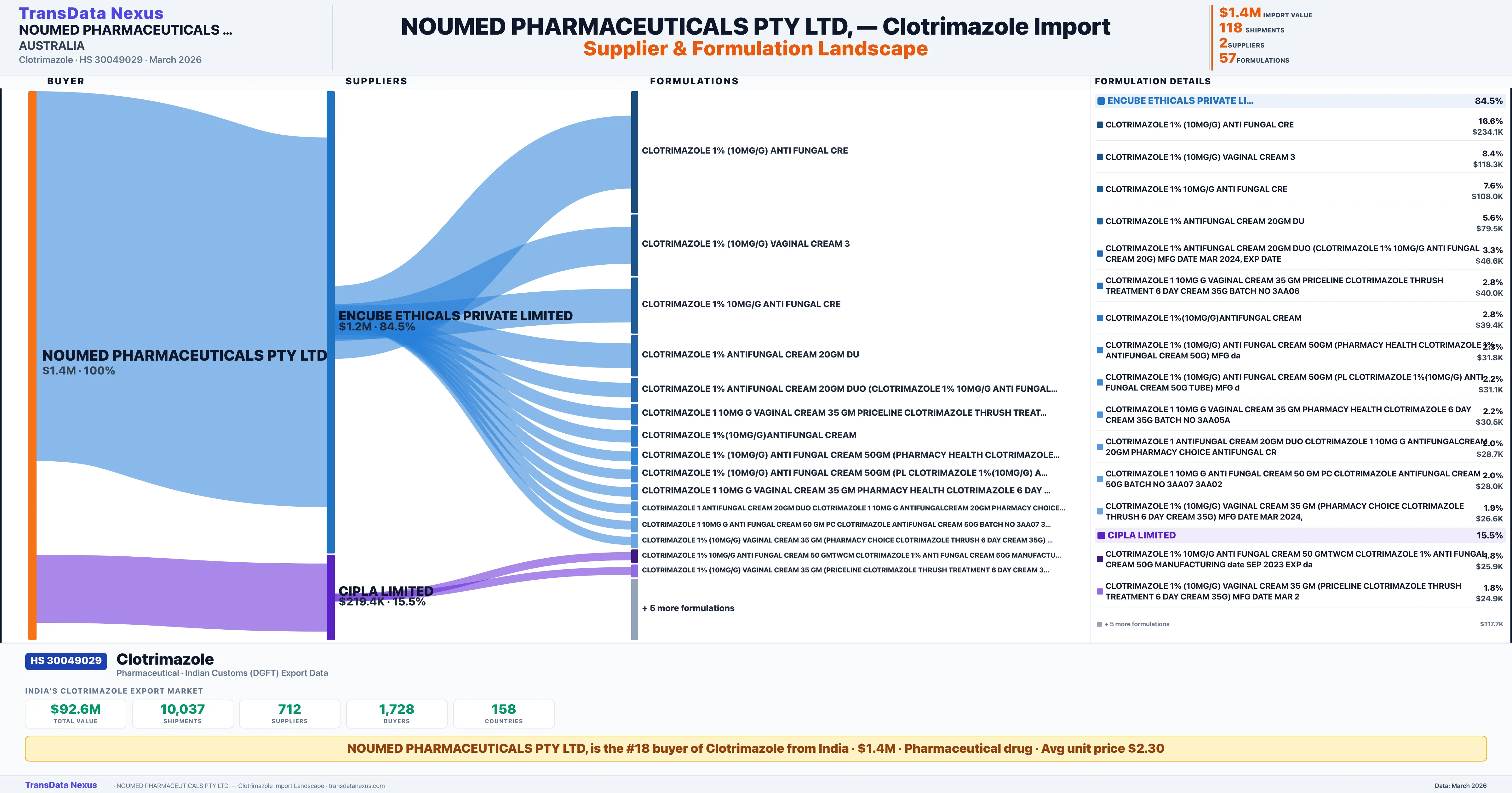 NOUMED PHARMACEUTICALS PTY LTD, sources Clotrimazole from 2 verified Indian suppliers: ENCUBE ETHICALS PRIVATE LIMITED ($1.2M, 84.5%), CIPLA LIMITED ($219.4K, 15.5%). This is based on 118 customs records.