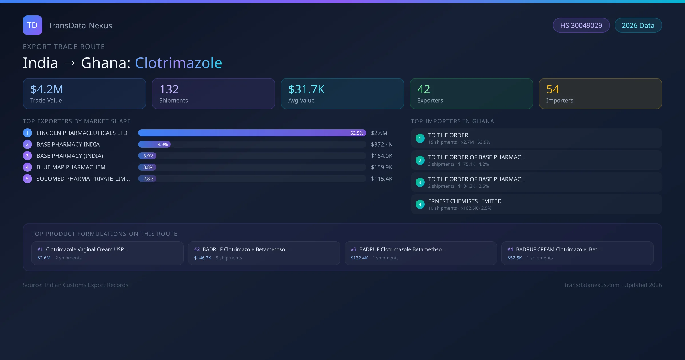 - 1.Route Identification: India to Ghana export trade corridor identified from Indian Customs (DGFT) records for Clotrimazole.