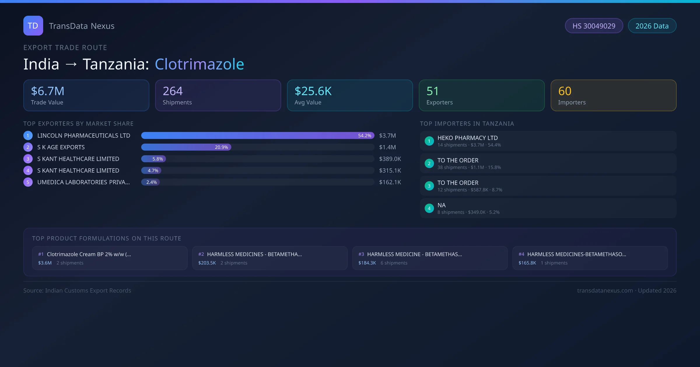 The India to Tanzania Clotrimazole corridor is one of India's established pharmaceutical export routes, with 264 shipments documented worth a combined $6.7M USD. The route is dominated by LINCOLN PHARMACEUTICALS LTD, which alone accounts for roughly 54% of all export value, reflecting the consolidated nature of India's clotrimazole manufacturing sector.