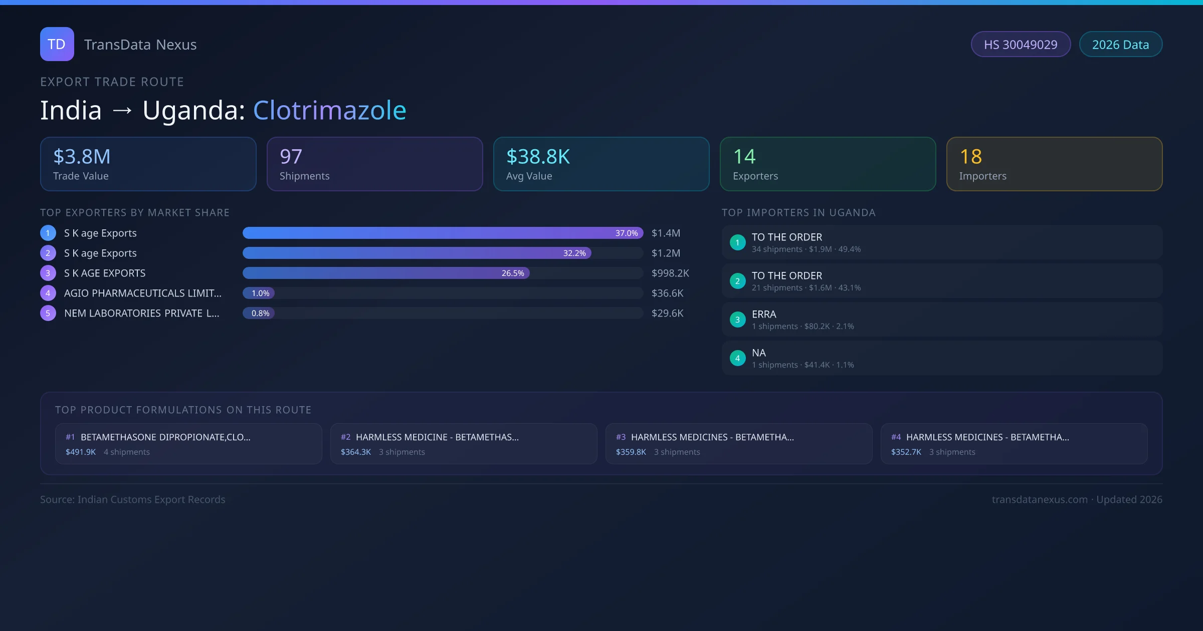 The India to Uganda Clotrimazole corridor is one of India's established pharmaceutical export routes, with 97 shipments documented worth a combined $3.8M USD. The route is dominated by S K age Exports, which alone accounts for roughly 37% of all export value, reflecting the consolidated nature of India's clotrimazole manufacturing sector.