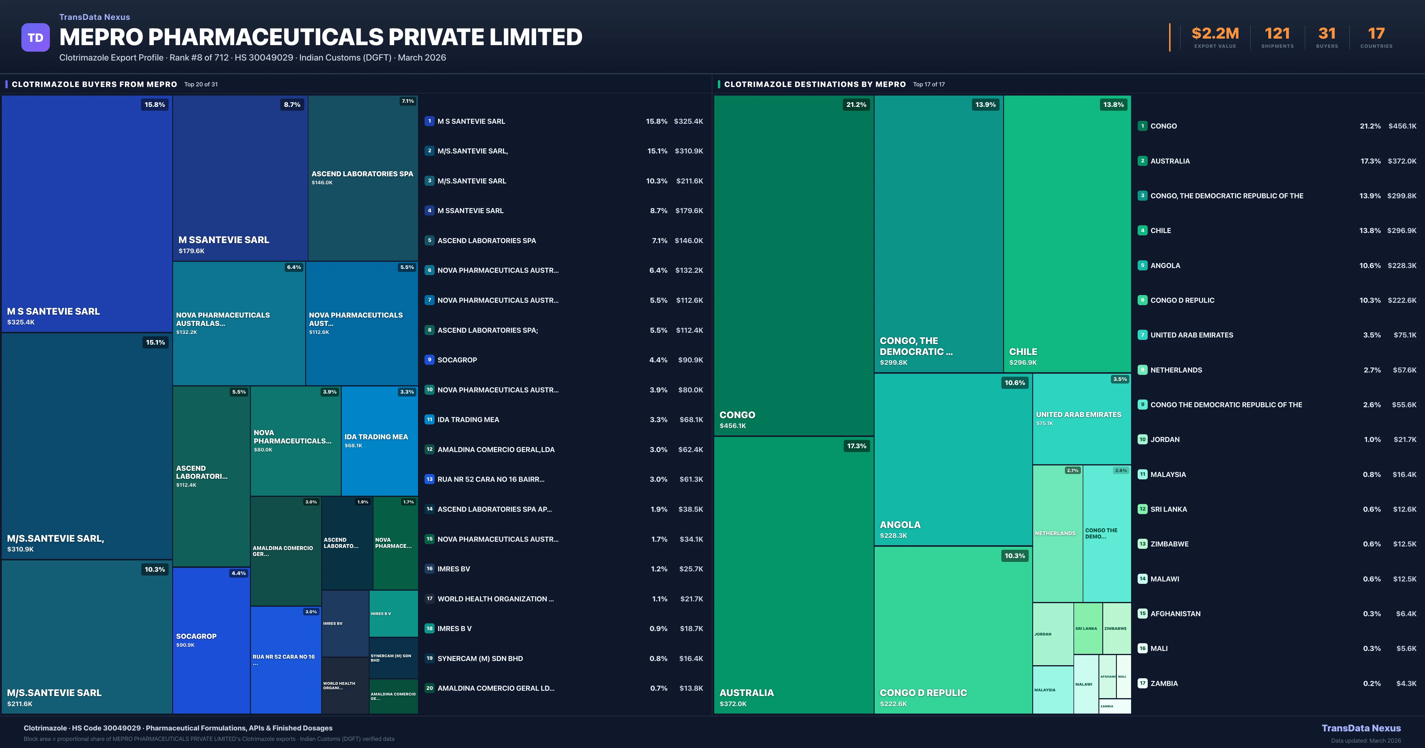 Mepro Pharmaceuticals Private Limited supplies Clotrimazole to 31 buyers globally. The largest buyer is M S SANTEVIE SARL (CONGO), followed by M/S.SANTEVIE SARL, (CONGO, THE DEMOCRATIC REPUBLIC OF THE) and M/S.SANTEVIE SARL (CONGO, THE DEMOCRATIC REPUBLIC OF THE). These buyers represent pharmaceutical distributors, hospital groups, and government procurement agencies in their respective markets.