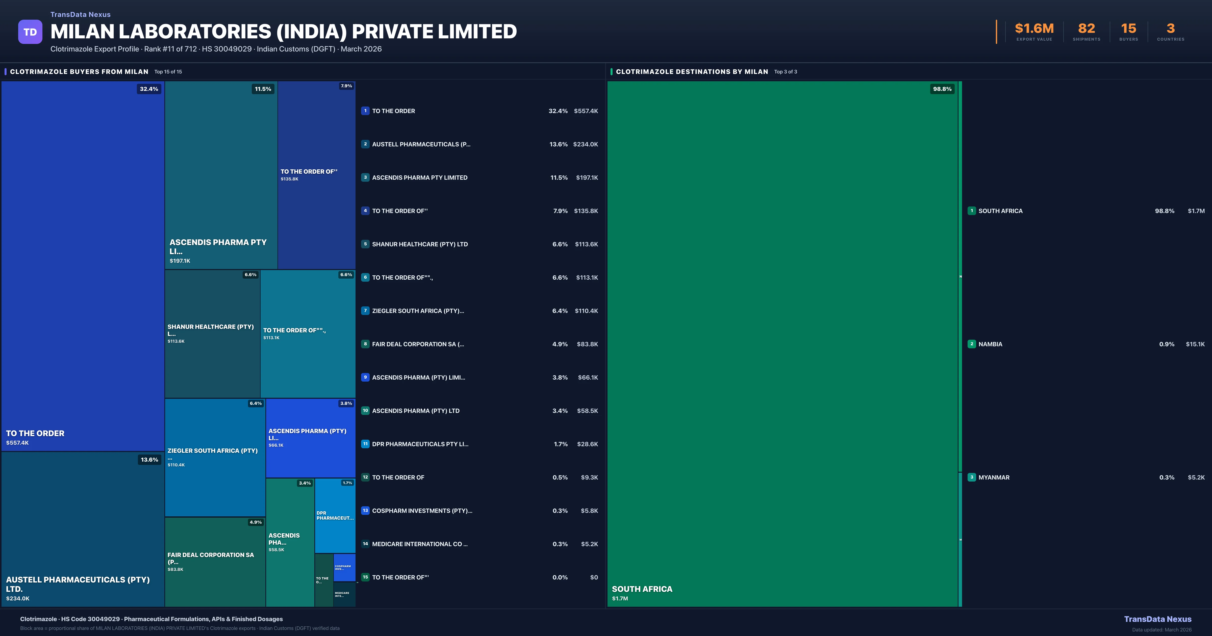 Milan Laboratories (india) Private Limited supplies Clotrimazole to 15 buyers globally. The largest buyer is TO THE ORDER (SOUTH AFRICA), followed by AUSTELL PHARMACEUTICALS (PTY) LTD. (SOUTH AFRICA) and ASCENDIS PHARMA PTY LIMITED (SOUTH AFRICA). These buyers represent pharmaceutical distributors, hospital groups, and government procurement agencies in their respective markets.