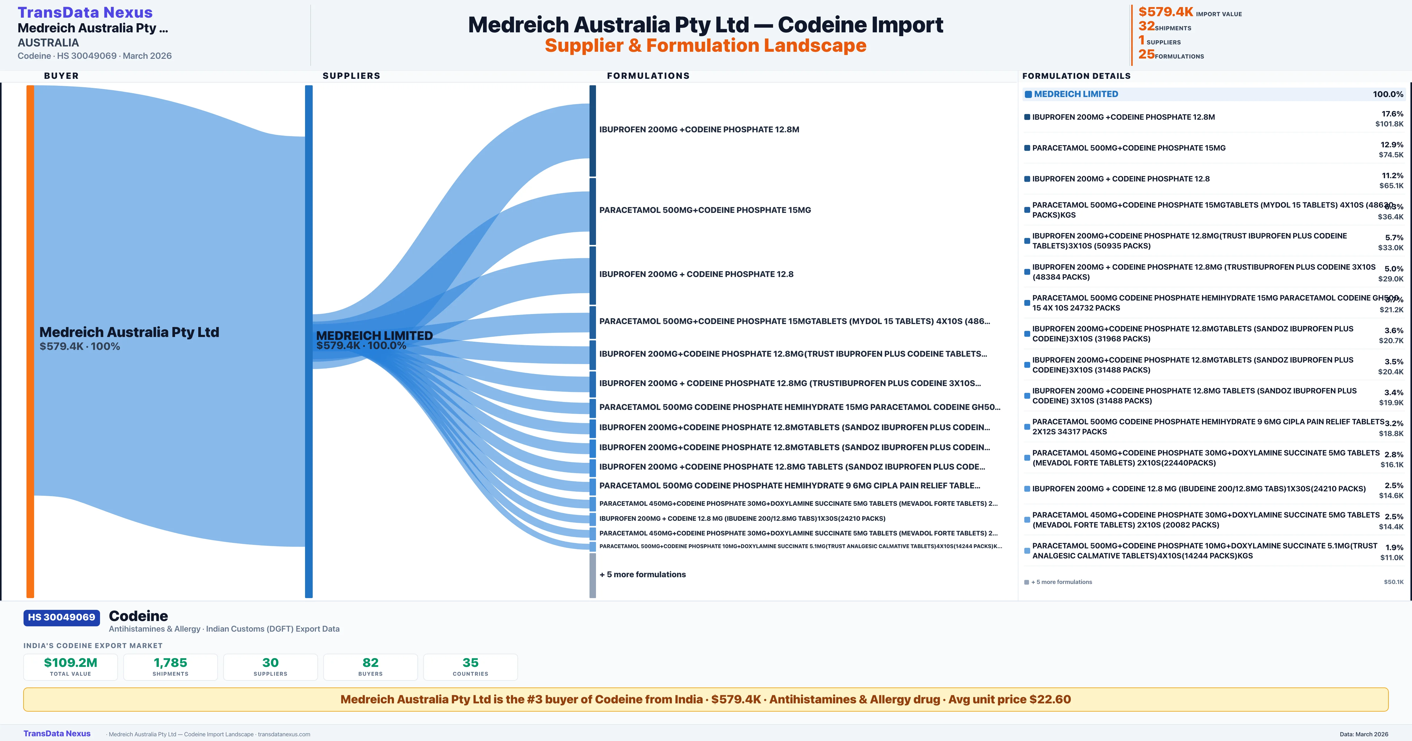 MEDREICH AUSTRALIA PTY LTD sources Codeine from 1 verified Indian supplier: MEDREICH LIMITED ($579.4K, 100.0%). This is based on 32 customs records.