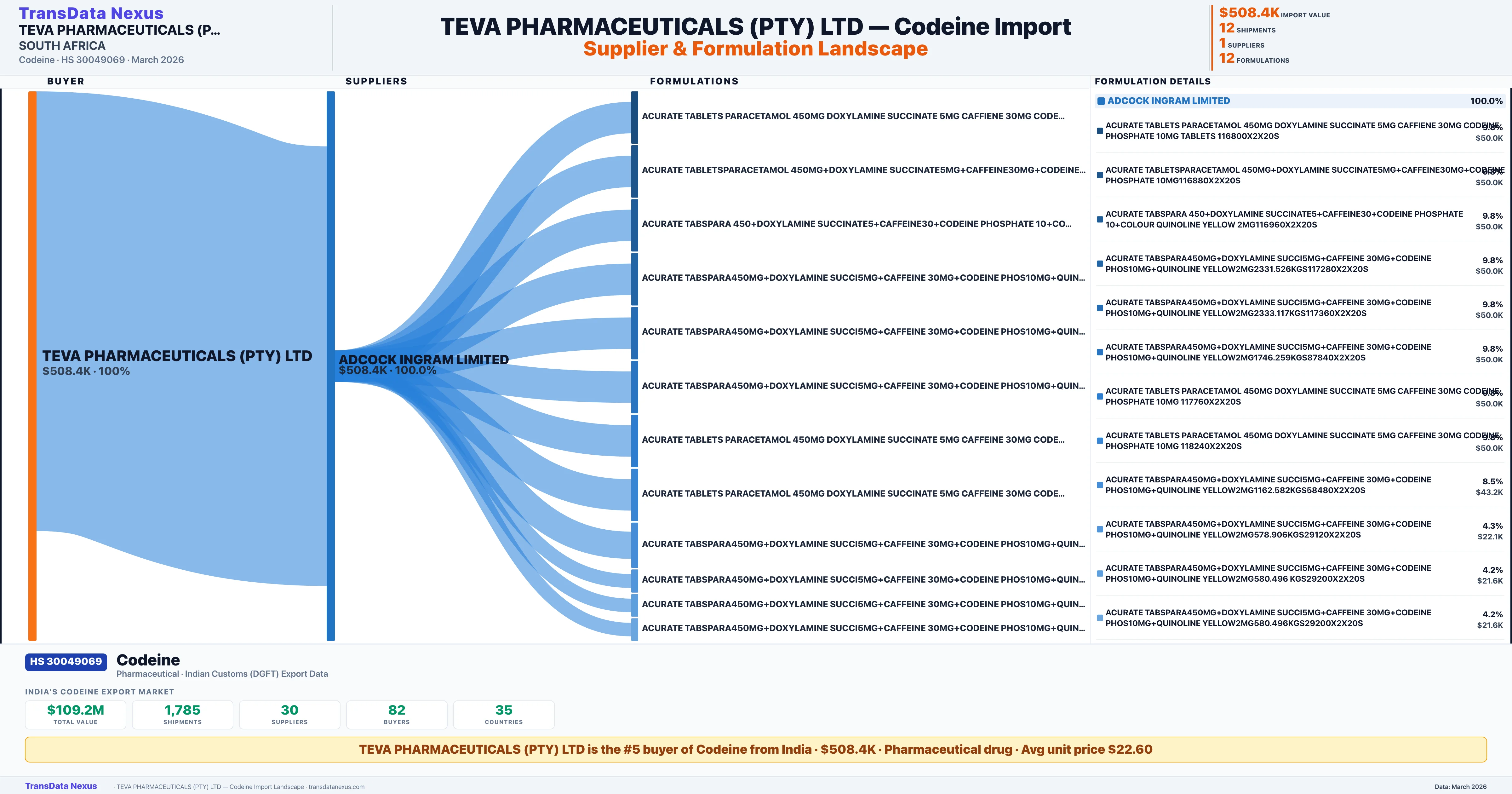 TEVA PHARMACEUTICALS (PTY) LTD imports 12 distinct Codeine formulations from India. The top formulation is ACURATE TABLETS PARACETAMOL 450MG DOXYLAMINE SUCCINATE 5MG C with 1 shipments worth $50.0K.