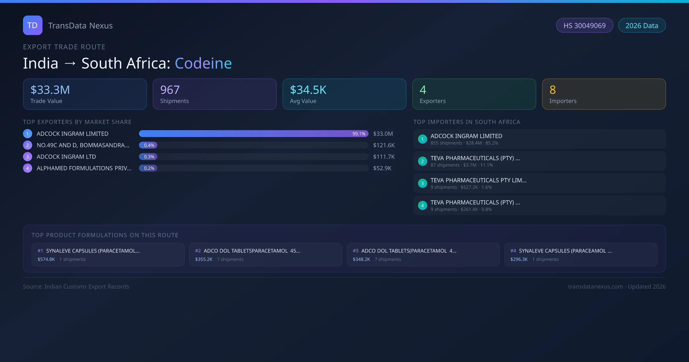 The India to South Africa Codeine corridor is one of India's established pharmaceutical export routes, with 967 shipments documented worth a combined $33.3M USD. The route is dominated by ADCOCK INGRAM LIMITED, which alone accounts for roughly 99% of all export value, reflecting the consolidated nature of India's codeine manufacturing sector.
