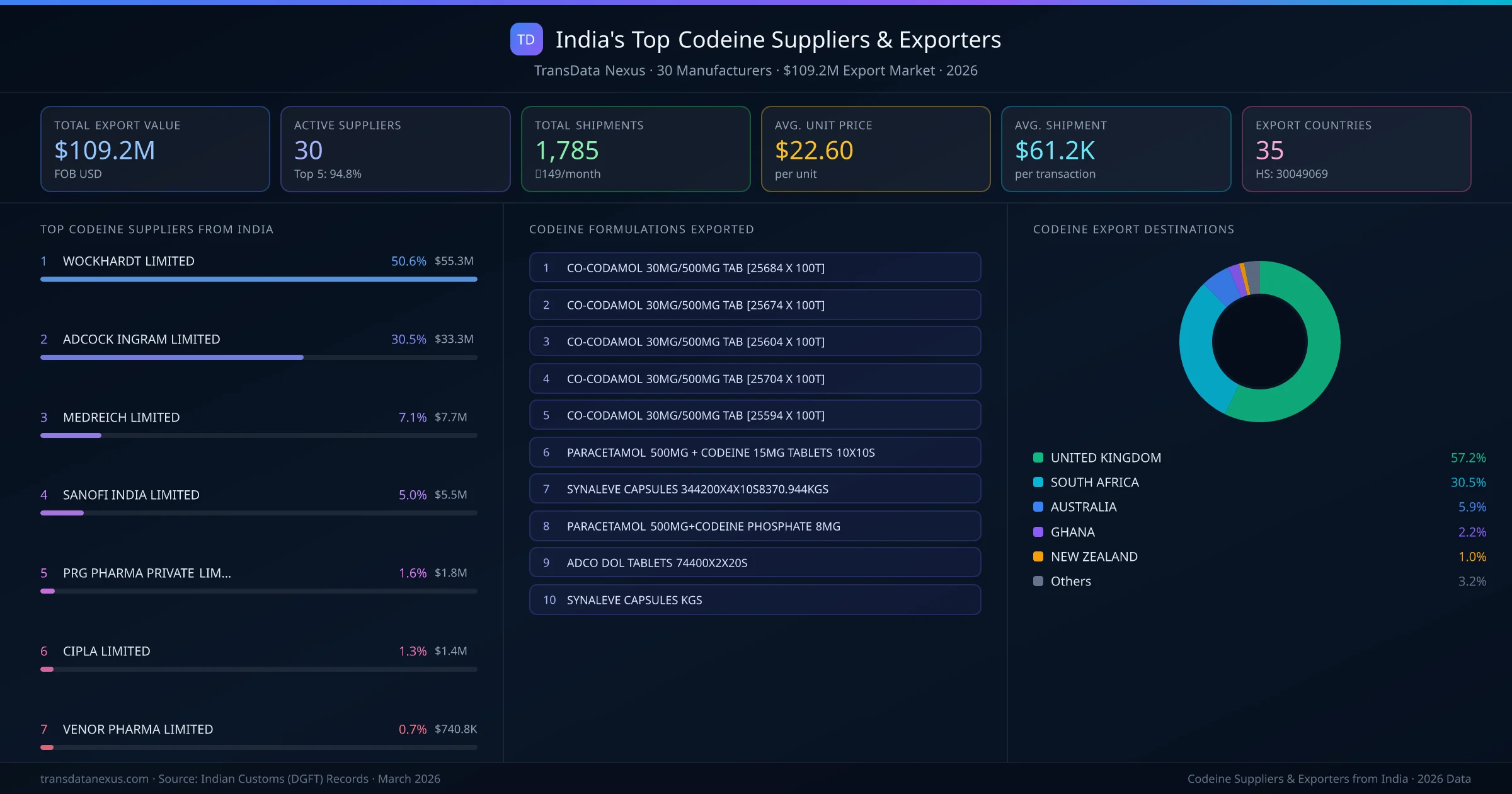 WOCKHARDT LIMITED is the leading codeine exporter from India, holding a 50.6% share of the $109.2M market across 1,785 shipments from 30 exporters. The top 5 suppliers β WOCKHARDT LIMITED, ADCOCK INGRAM LIMITED, MEDREICH LIMITED, SANOFI INDIA LIMITED, PRG PHARMA PRIVATE LIMITED β collectively control 94.8% of total export value, indicating a highly concentrated market. Individual shares are: WOCKHARDT LIMITED (50.6%), ADCOCK INGRAM LIMITED (30.5%), MEDREICH LIMITED (7.1%), SANOFI INDIA LIMITED (5.0%), PRG PHARMA PRIVATE LIMITED (1.6%).