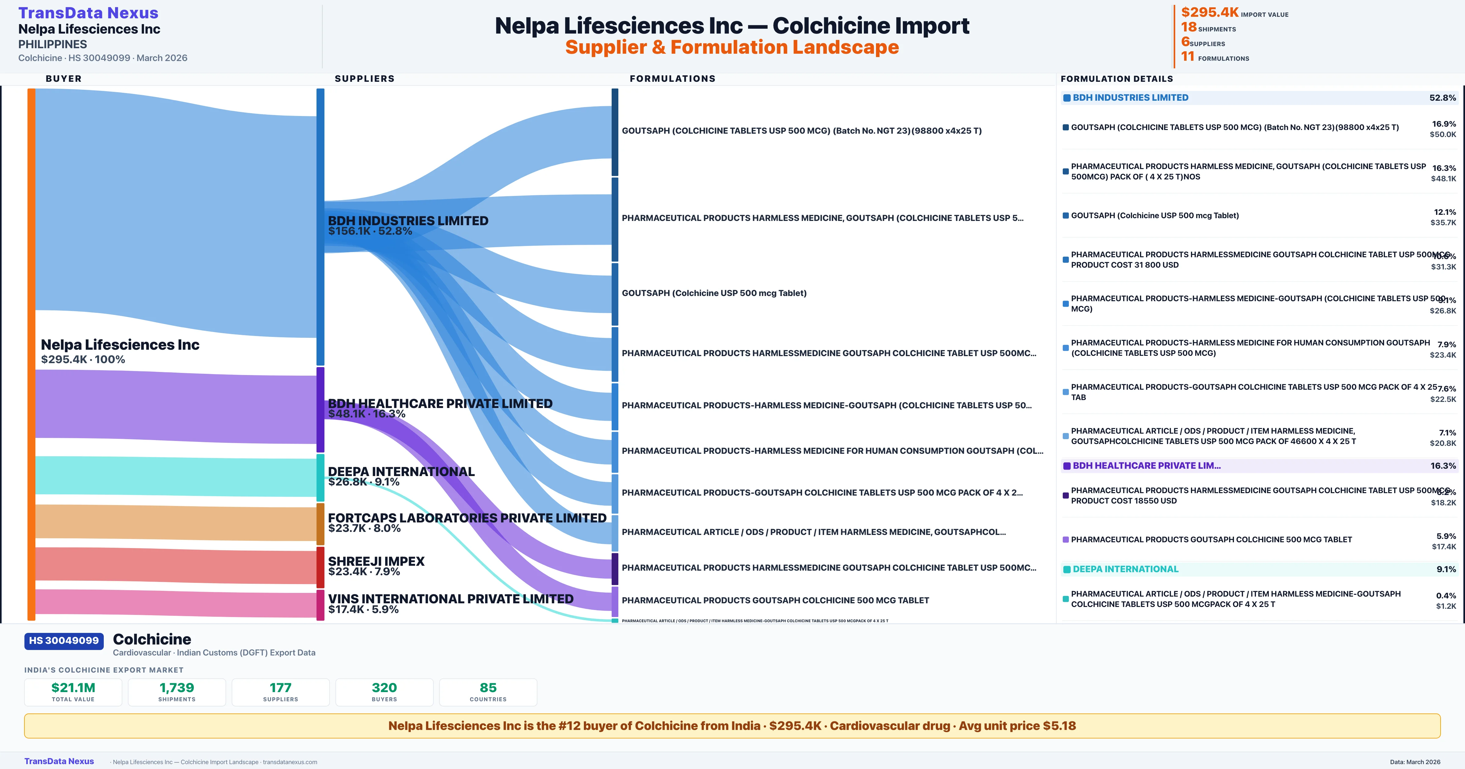 NELPA LIFESCIENCES INC sources Colchicine from 6 verified Indian suppliers: BDH INDUSTRIES LIMITED ($156.1K, 52.8%), BDH HEALTHCARE PRIVATE LIMITED ($48.1K, 16.3%), DEEPA INTERNATIONAL ($26.8K, 9.1%), FORTCAPS LABORATORIES PRIVATE LIMITED ($23.7K, 8.0%), SHREEJI IMPEX ($23.4K, 7.9%). This is based on 18 customs records.