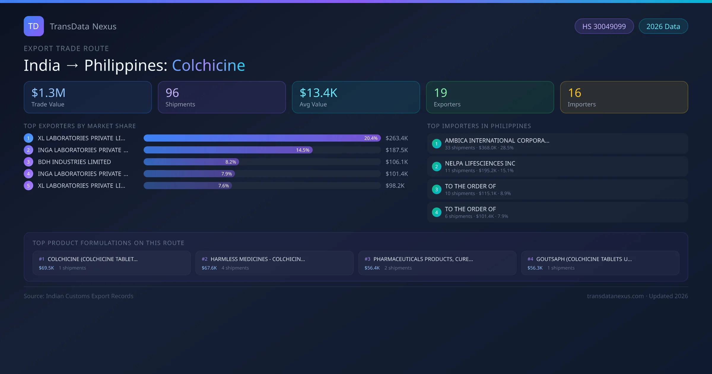 - 1.Route Identification: India to Philippines export trade corridor identified from Indian Customs (DGFT) records for Colchicine.