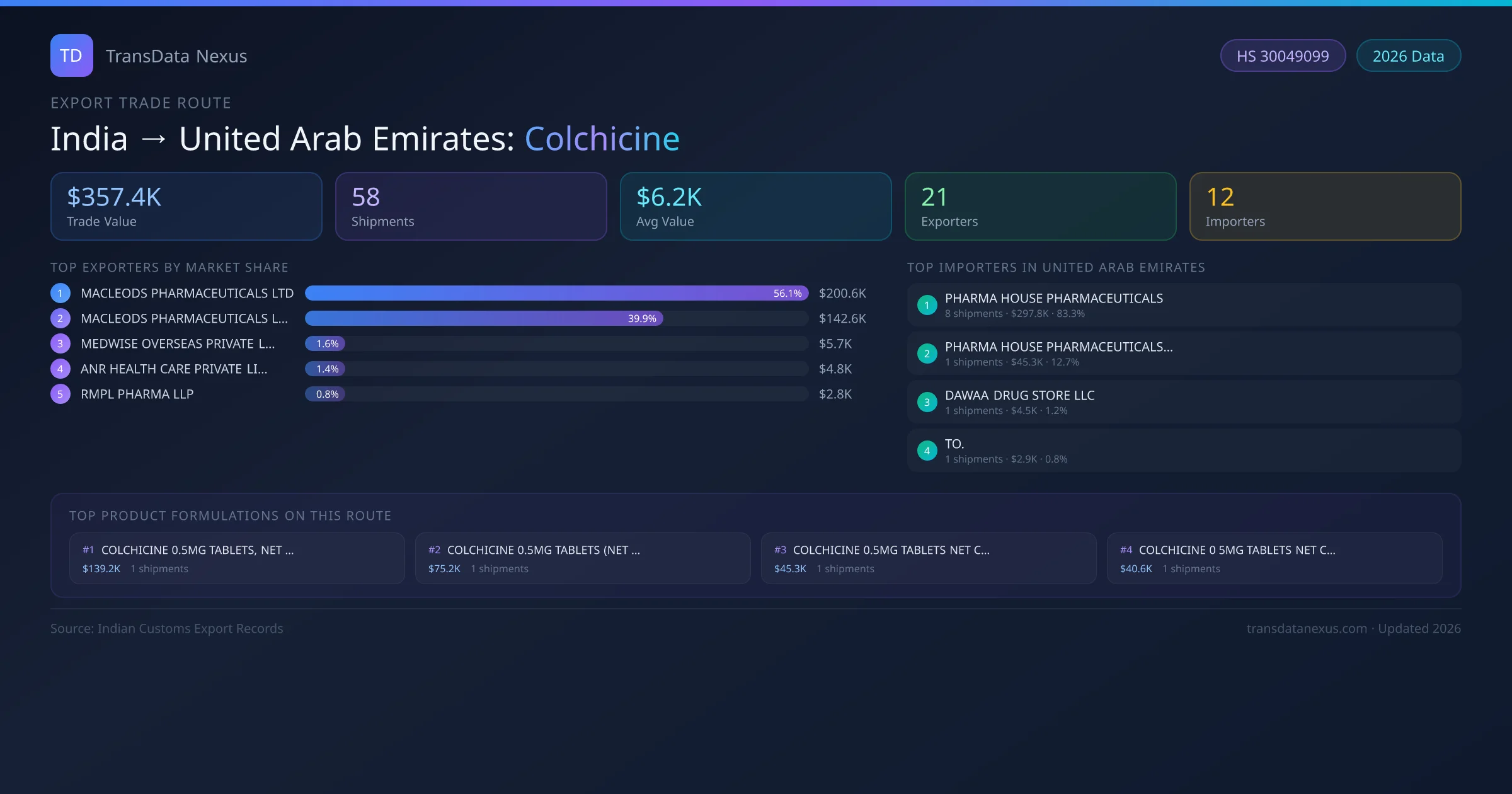 The India to United Arab Emirates Colchicine corridor is one of India's established pharmaceutical export routes, with 58 shipments documented worth a combined $357.4K USD. The route is dominated by MACLEODS PHARMACEUTICALS LTD, which alone accounts for roughly 56% of all export value, reflecting the consolidated nature of India's colchicine manufacturing sector.