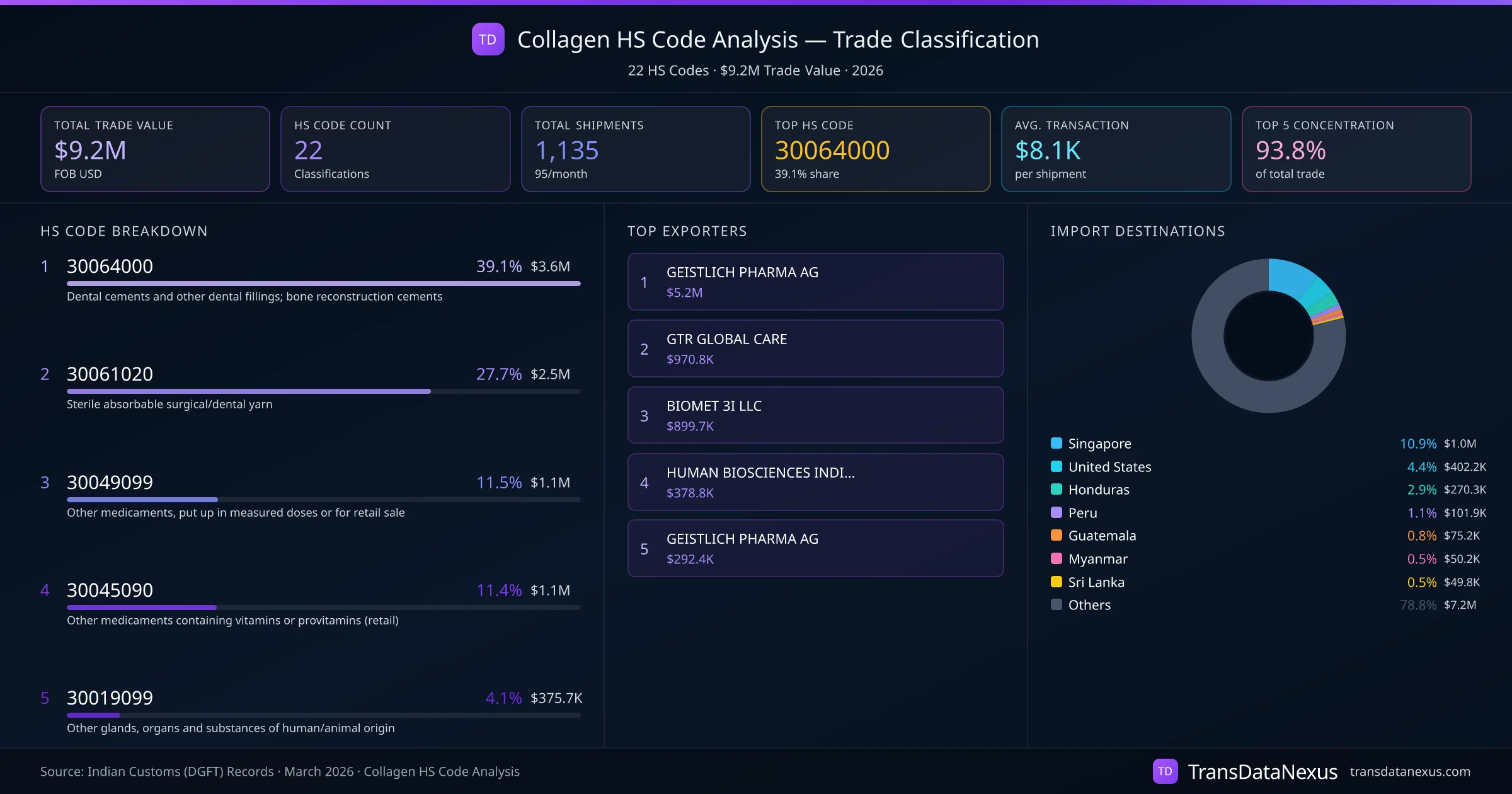 Collagen, classified under HS code 30064000, is subject to varying Most Favored Nation (MFN) tariff rates and preferential treatments across different countries.