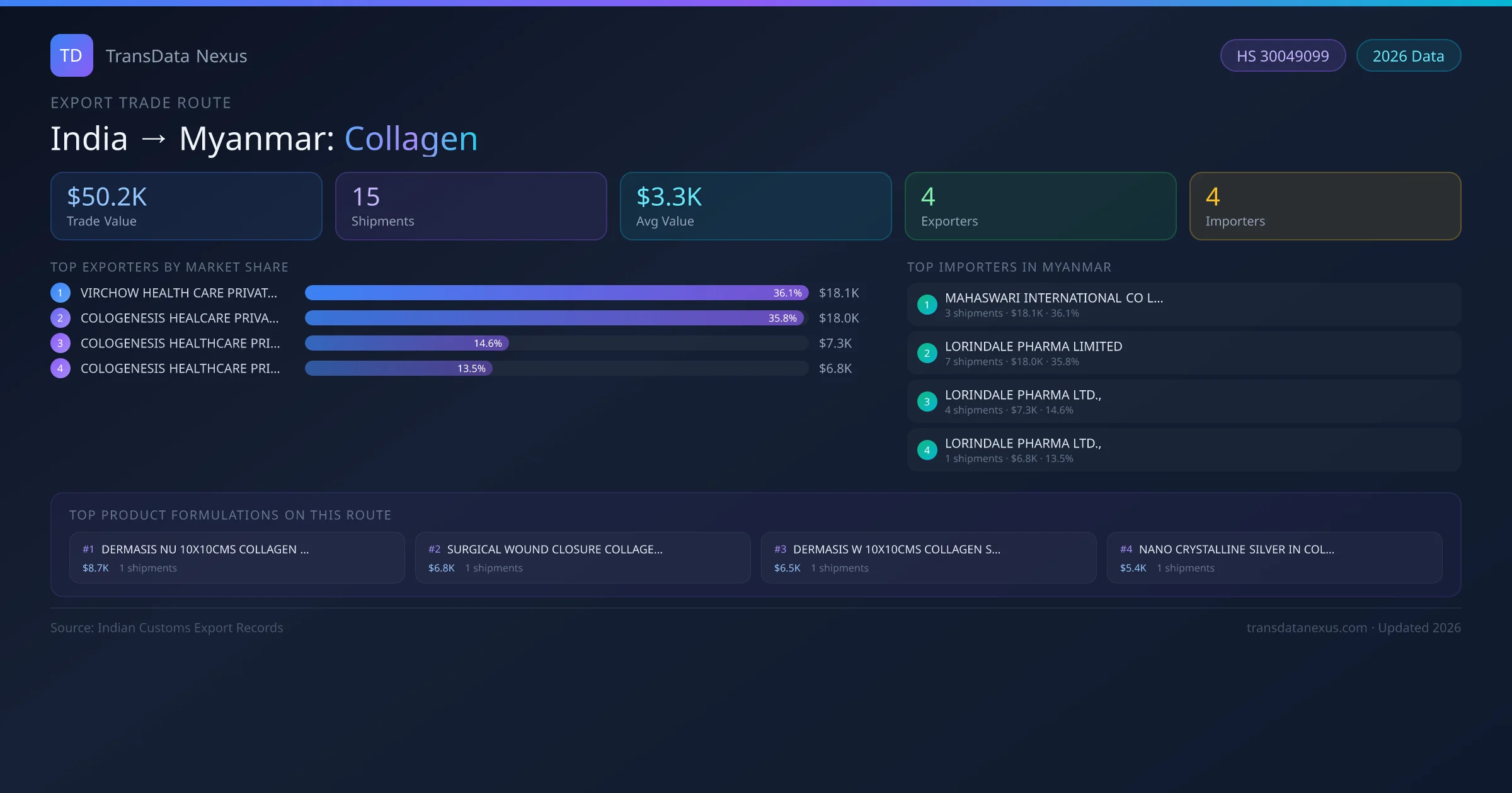 The India to Myanmar Collagen corridor is one of India's established pharmaceutical export routes, with 15 shipments documented worth a combined $50.2K USD. The route is dominated by VIRCHOW HEALTH CARE PRIVATE LIMITED, which alone accounts for roughly 36% of all export value, reflecting the consolidated nature of India's collagen manufacturing sector.