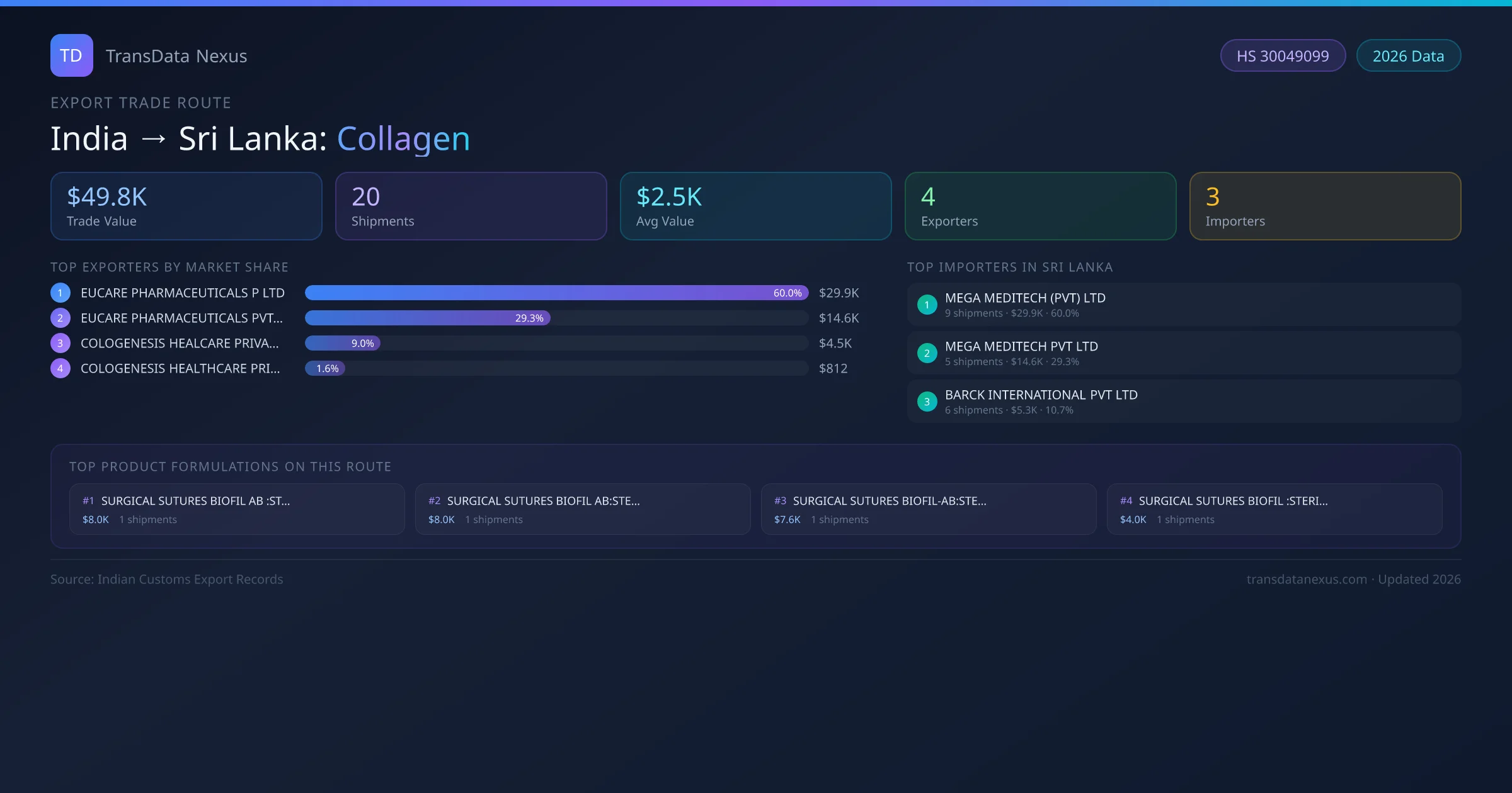 India has recorded 20 verified shipments of Collagen exported to Sri Lanka, representing a combined trade value of $49.8K USD. This corridor is served by 4 active Indian exporters, with an average shipment value of $2.5K USD. The leading Indian exporter is EUCARE PHARMACEUTICALS P LTD, which accounts for 60% of total export value with 9 shipments worth $29.9K USD. On the buying side, MEGA MEDITECH (PVT) LTD is the largest importer in Sri Lanka with $29.9K USD in purchases. The top 3 suppliers — EUCARE PHARMACEUTICALS P LTD, EUCARE PHARMACEUTICALS PVT LTD, COLOGENESIS HEALCARE PRIVATE LIMITED — together control 98% of total trade value on this route. All data sourced from Indian Customs (DGFT) shipping bill records. Values reported in FOB USD.