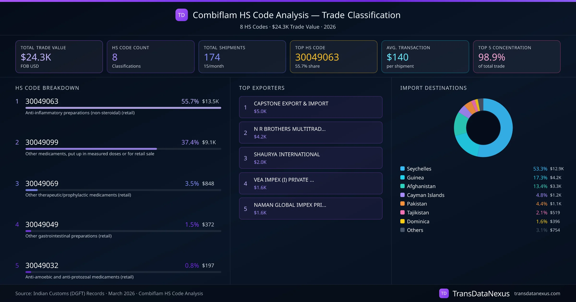 India exports Combiflam under 8 distinct HS code classifications, representing a total trade value of $24.3K across 174 shipments. The dominant classification is HS 30049063 (Anti-inflammatory preparations (non-steroidal) (retail)), accounting for 55.7% of all Combiflam trade at $13.5K. HS 30049099 (Other medicaments, put up in measured doses or for retail sale) follows at 37.4% ($9.1K). The top 5 HS codes together account for 98.9% of total Combiflam trade from India. The average transaction value is $140. Key importing markets include Seychelles, Guinea, Afghanistan. Leading exporters include CAPSTONE EXPORT & IMPORT and N R BROTHERS MULTITRADE LLP. Data sourced from Indian Customs (DGFT) shipping bill records.