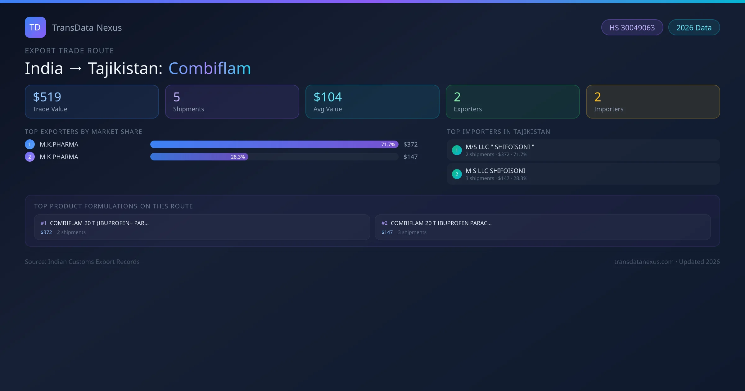 India has recorded 5 verified shipments of Combiflam exported to Tajikistan, representing a combined trade value of $519 USD. This corridor is served by 2 active Indian exporters, with an average shipment value of $104 USD. The leading Indian exporter is M.K.PHARMA, which accounts for 72% of total export value with 2 shipments worth $372 USD. On the buying side, M/S LLC " SHIFOISONI " is the largest importer in Tajikistan with $372 USD in purchases. All data sourced from Indian Customs (DGFT) shipping bill records. Values reported in FOB USD.