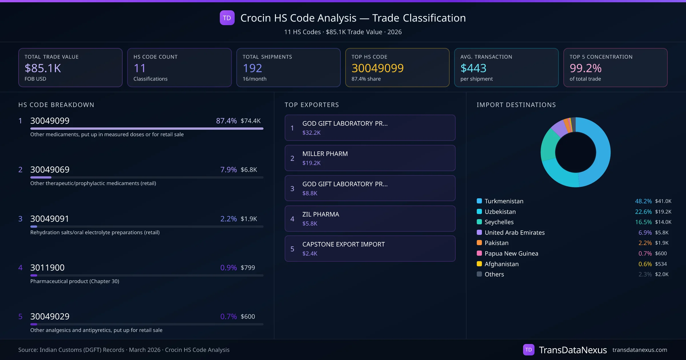 India exports Crocin under 11 distinct HS code classifications, representing a total trade value of $85.1K across 192 shipments. The dominant classification is HS 30049099 (Other medicaments, put up in measured doses or for retail sale), accounting for 87.4% of all Crocin trade at $74.4K. HS 30049069 (Other therapeutic/prophylactic medicaments (retail)) follows at 7.9% ($6.8K). The top 5 HS codes together account for 99.2% of total Crocin trade from India. The average transaction value is $443. Key importing markets include Turkmenistan, Uzbekistan, Seychelles. Leading exporters include GOD GIFT LABORATORY PRIVATE LIMITED and MILLER PHARM. Data sourced from Indian Customs (DGFT) shipping bill records.