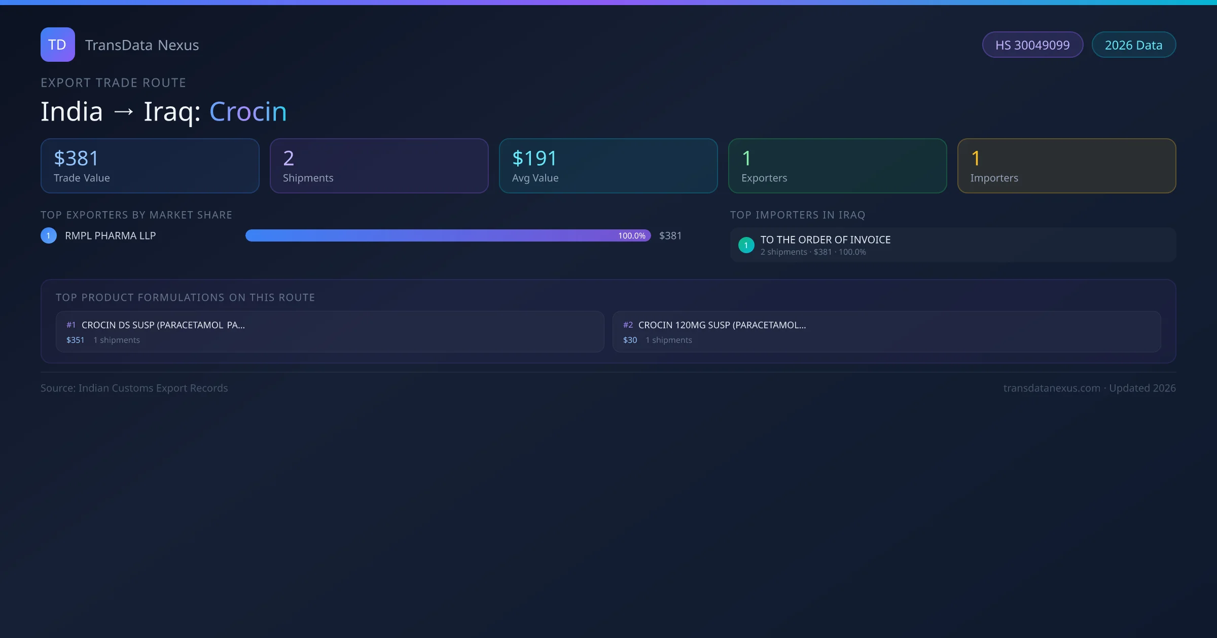 India has recorded 2 verified shipments of Crocin exported to Iraq, representing a combined trade value of $381 USD. This corridor is served by 1 active Indian exporters, with an average shipment value of $191 USD. The leading Indian exporter is RMPL PHARMA LLP, which accounts for 100% of total export value with 2 shipments worth $381 USD. On the buying side, TO THE ORDER OF INVOICE is the largest importer in Iraq with $381 USD in purchases. All data sourced from Indian Customs (DGFT) shipping bill records. Values reported in FOB USD.