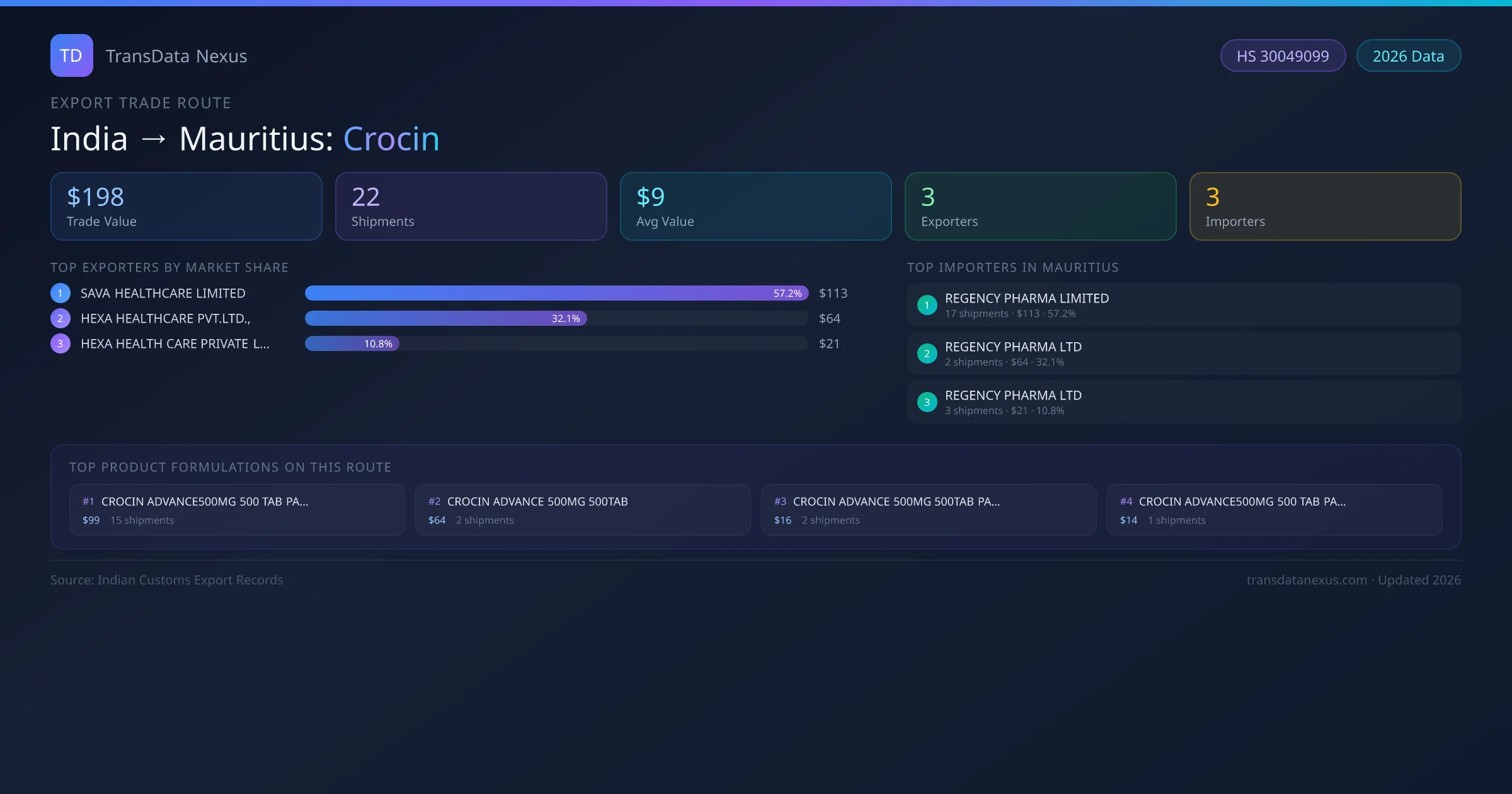 India has recorded 22 verified shipments of Crocin exported to Mauritius, representing a combined trade value of $198 USD. This corridor is served by 3 active Indian exporters, with an average shipment value of $9 USD. The leading Indian exporter is SAVA HEALTHCARE LIMITED, which accounts for 57% of total export value with 17 shipments worth $113 USD. On the buying side, REGENCY PHARMA LIMITED is the largest importer in Mauritius with $113 USD in purchases. The top 3 suppliers — SAVA HEALTHCARE LIMITED, HEXA HEALTHCARE PVT.LTD., , HEXA HEALTH CARE PRIVATE LIMITED — together control 100% of total trade value on this route. All data sourced from Indian Customs (DGFT) shipping bill records. Values reported in FOB USD.