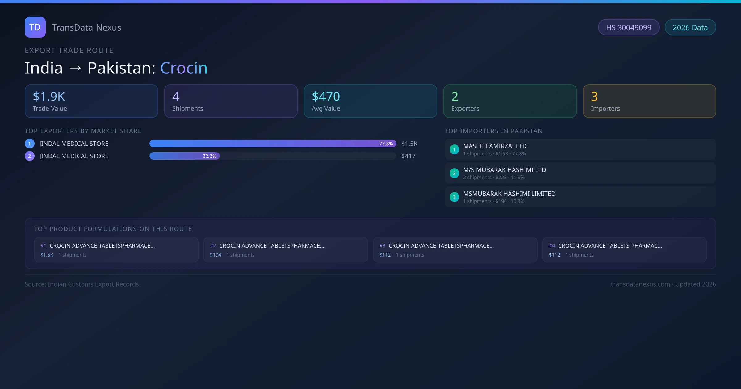 The India to Pakistan Crocin corridor is one of India's established pharmaceutical export routes, with 4 shipments documented worth a combined $1.9K USD. The route is dominated by JINDAL MEDICAL STORE , which alone accounts for roughly 78% of all export value, reflecting the consolidated nature of India's crocin manufacturing sector.