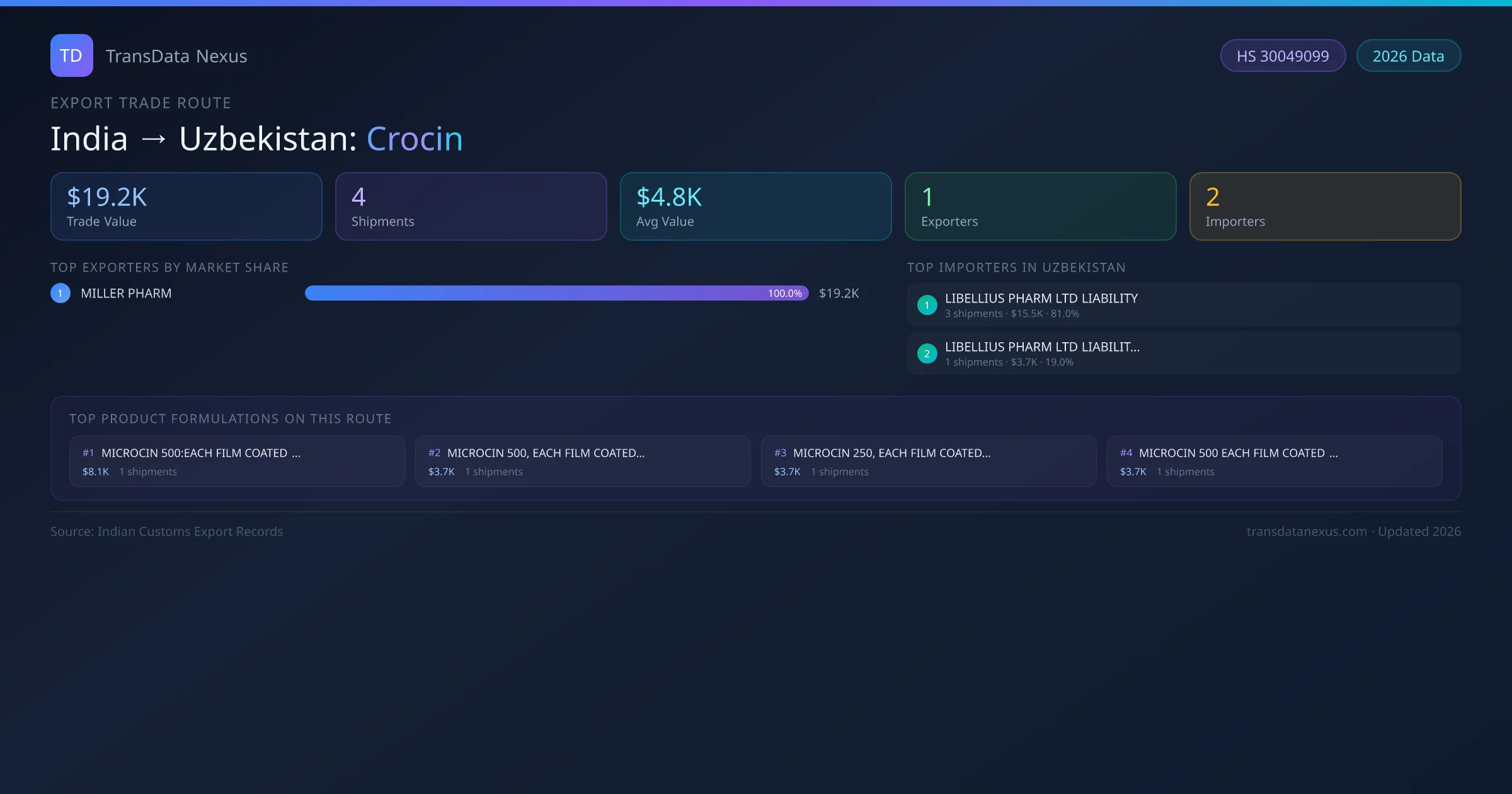 The India to Uzbekistan Crocin corridor is one of India's established pharmaceutical export routes, with 4 shipments documented worth a combined $19.2K USD. The route is dominated by MILLER PHARM, which alone accounts for roughly 100% of all export value, reflecting the consolidated nature of India's crocin manufacturing sector.