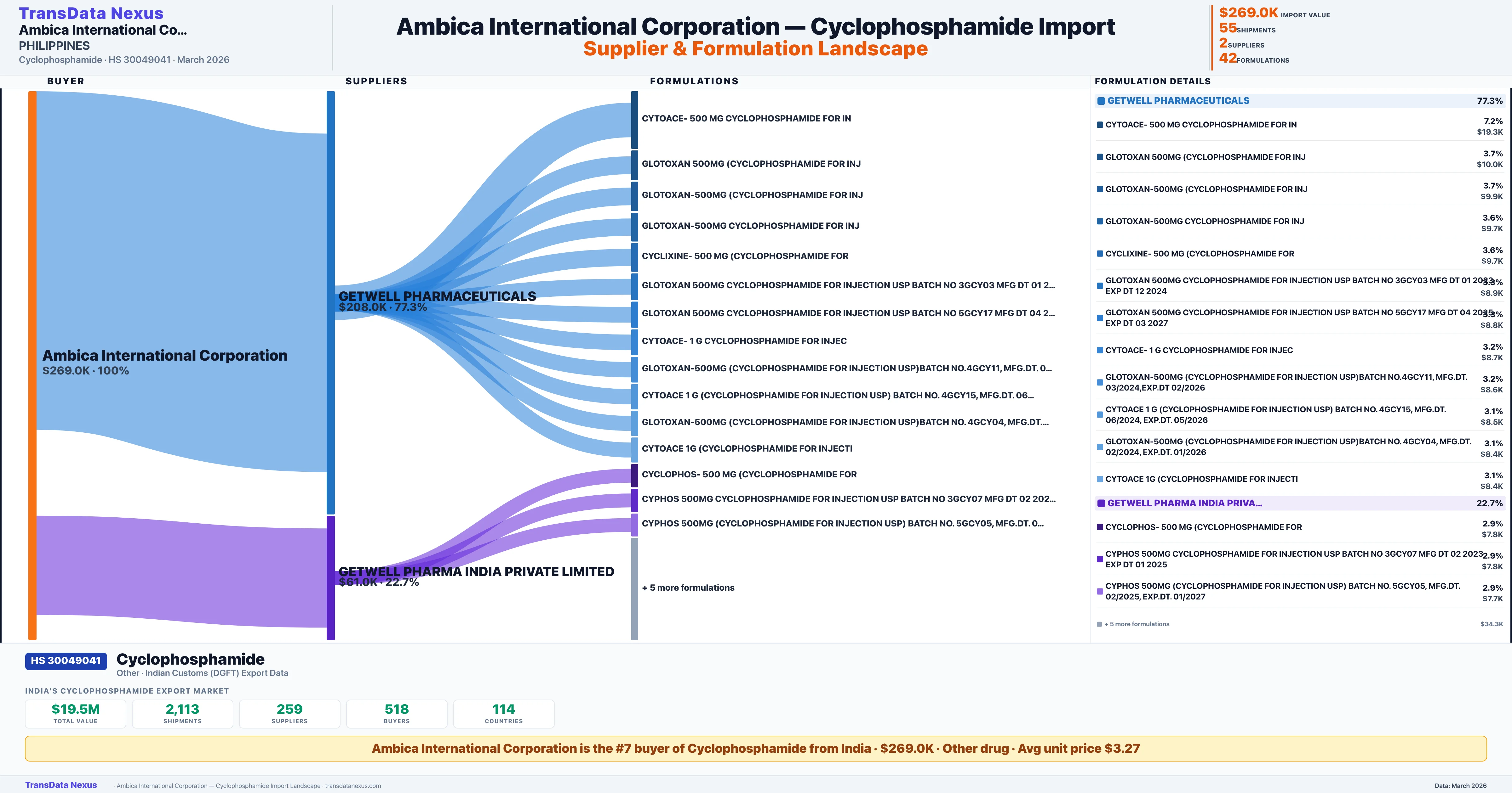 AMBICA INTERNATIONAL CORPORATION sources Cyclophosphamide from 2 verified Indian suppliers: GETWELL PHARMACEUTICALS ($208.0K, 77.3%), GETWELL PHARMA INDIA PRIVATE LIMITED ($61.0K, 22.7%). This is based on 55 customs records.