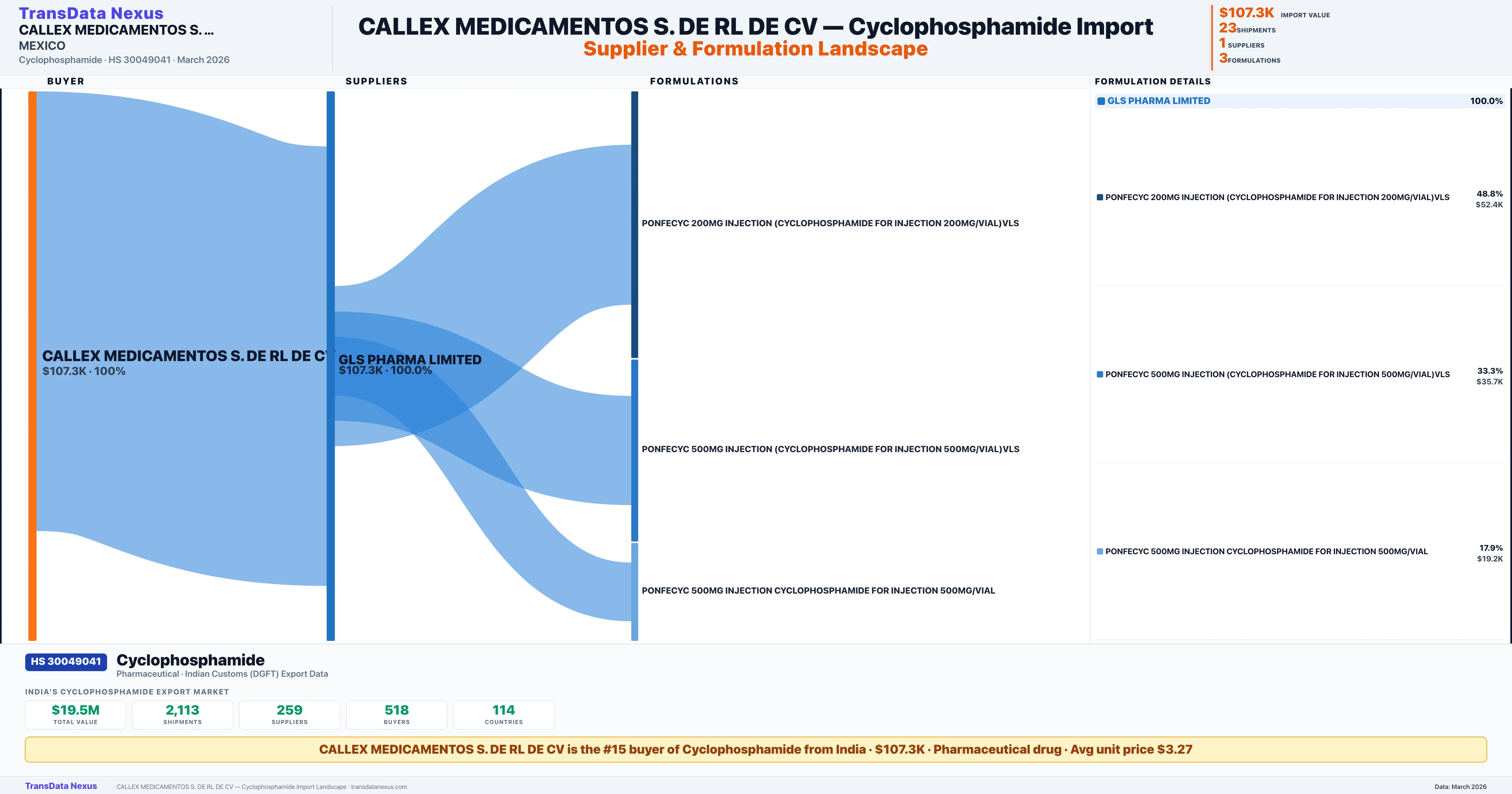 CALLEX MEDICAMENTOS S. DE RL DE CV sources Cyclophosphamide from 1 verified Indian supplier: GLS PHARMA LIMITED ($107.3K, 100.0%). This is based on 23 customs records.