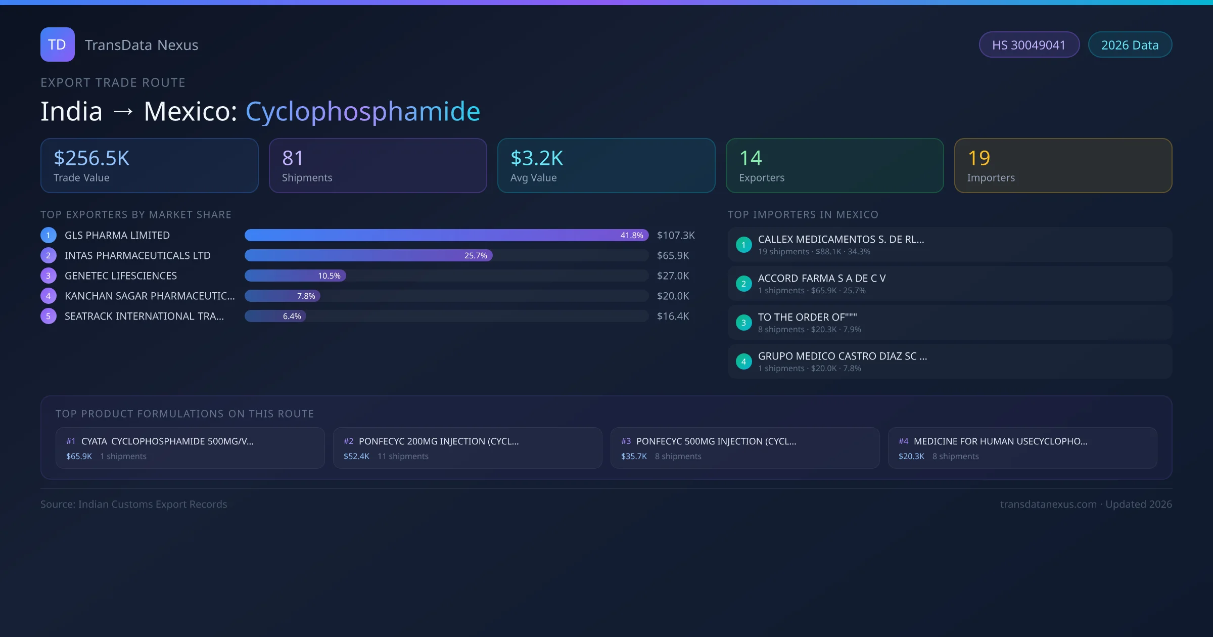 India has recorded 81 verified shipments of Cyclophosphamide exported to Mexico, representing a combined trade value of $256.5K USD. This corridor is served by 14 active Indian exporters, with an average shipment value of $3.2K USD. The leading Indian exporter is GLS PHARMA LIMITED, which accounts for 42% of total export value with 23 shipments worth $107.3K USD. On the buying side, CALLEX MEDICAMENTOS S. DE RL DE CV is the largest importer in Mexico with $88.1K USD in purchases. The top 3 suppliers — GLS PHARMA LIMITED, INTAS PHARMACEUTICALS LTD, GENETEC LIFESCIENCES — together control 78% of total trade value on this route. All data sourced from Indian Customs (DGFT) shipping bill records. Values reported in FOB USD.