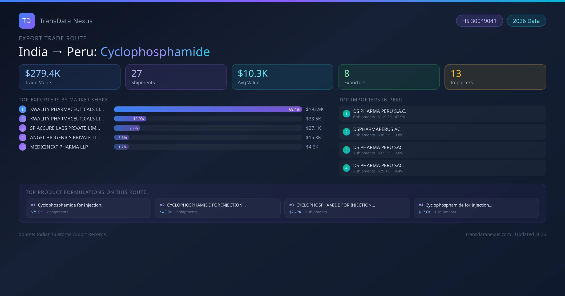India has recorded 27 verified shipments of Cyclophosphamide exported to Peru, representing a combined trade value of $279.4K USD. This corridor is served by 8 active Indian exporters, with an average shipment value of $10.3K USD. The leading Indian exporter is KWALITY PHARMACEUTICALS LIMITED, which accounts for 69% of total export value with 15 shipments worth $193.9K USD. On the buying side, DS PHARMA PERU S.A.C. is the largest importer in Peru with $119.9K USD in purchases. The top 3 suppliers — KWALITY PHARMACEUTICALS LIMITED, KWALITY PHARMACEUTICALS LIMITED , SP ACCURE LABS PRIVATE LIMITED — together control 91% of total trade value on this route. All data sourced from Indian Customs (DGFT) shipping bill records. Values reported in FOB USD.