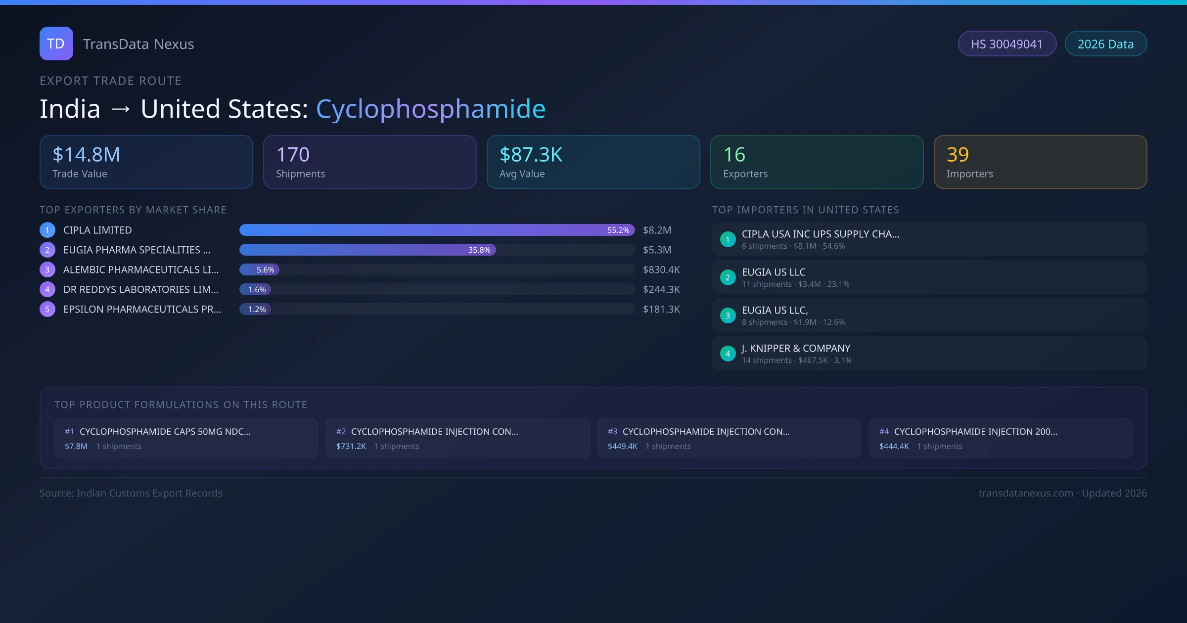 On the import side, key buyers of Indian cyclophosphamide in United States include CIPLA USA INC UPS SUPPLY CHAIN SOLU, EUGIA US LLC, EUGIA US LLC, and 36 others. CIPLA USA INC UPS SUPPLY CHAIN SOLU is the single largest importer with 6 shipments valued at $8.1M USD.