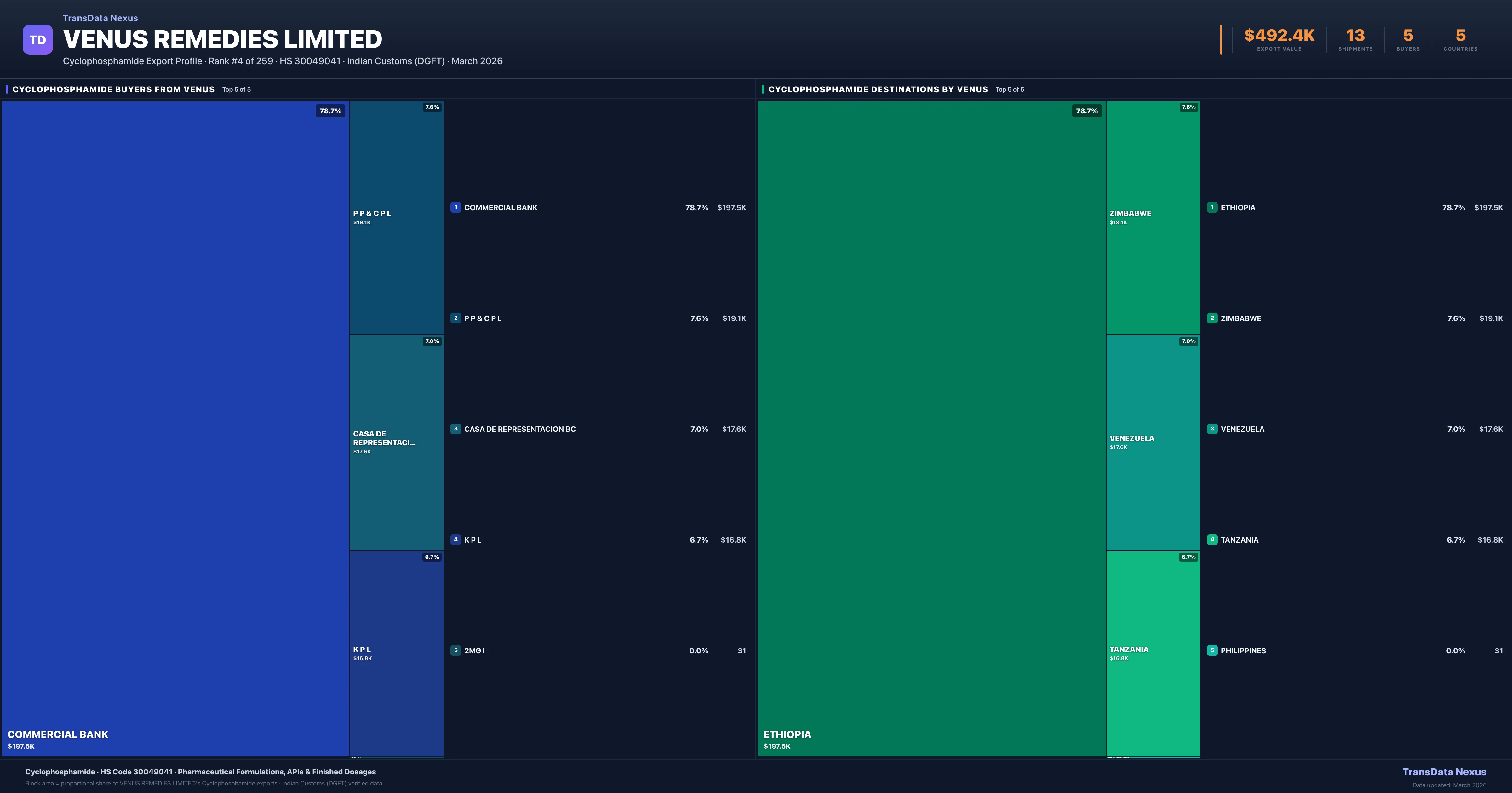 Access shipment-level details, pricing data, buyer connections, and competitive analysis for Venus Remedies Limited's Cyclophosphamide exports. TransData Nexus provides verified Indian Customs (DGFT) data trusted by pharmaceutical trade professionals worldwide.