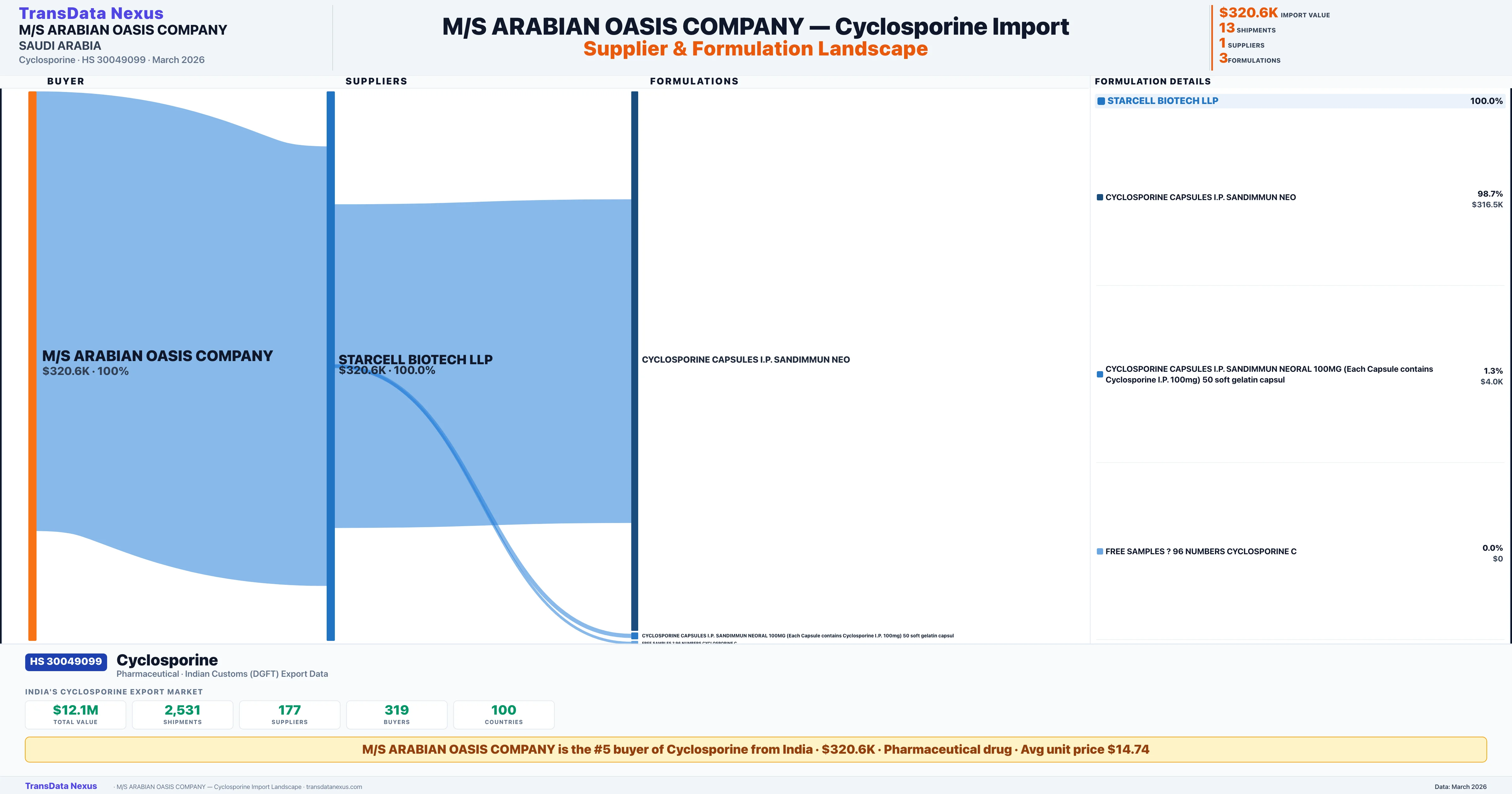 M/S ARABIAN OASIS COMPANY sources Cyclosporine from 1 verified Indian supplier: STARCELL BIOTECH LLP ($320.6K, 100.0%). This is based on 13 customs records.