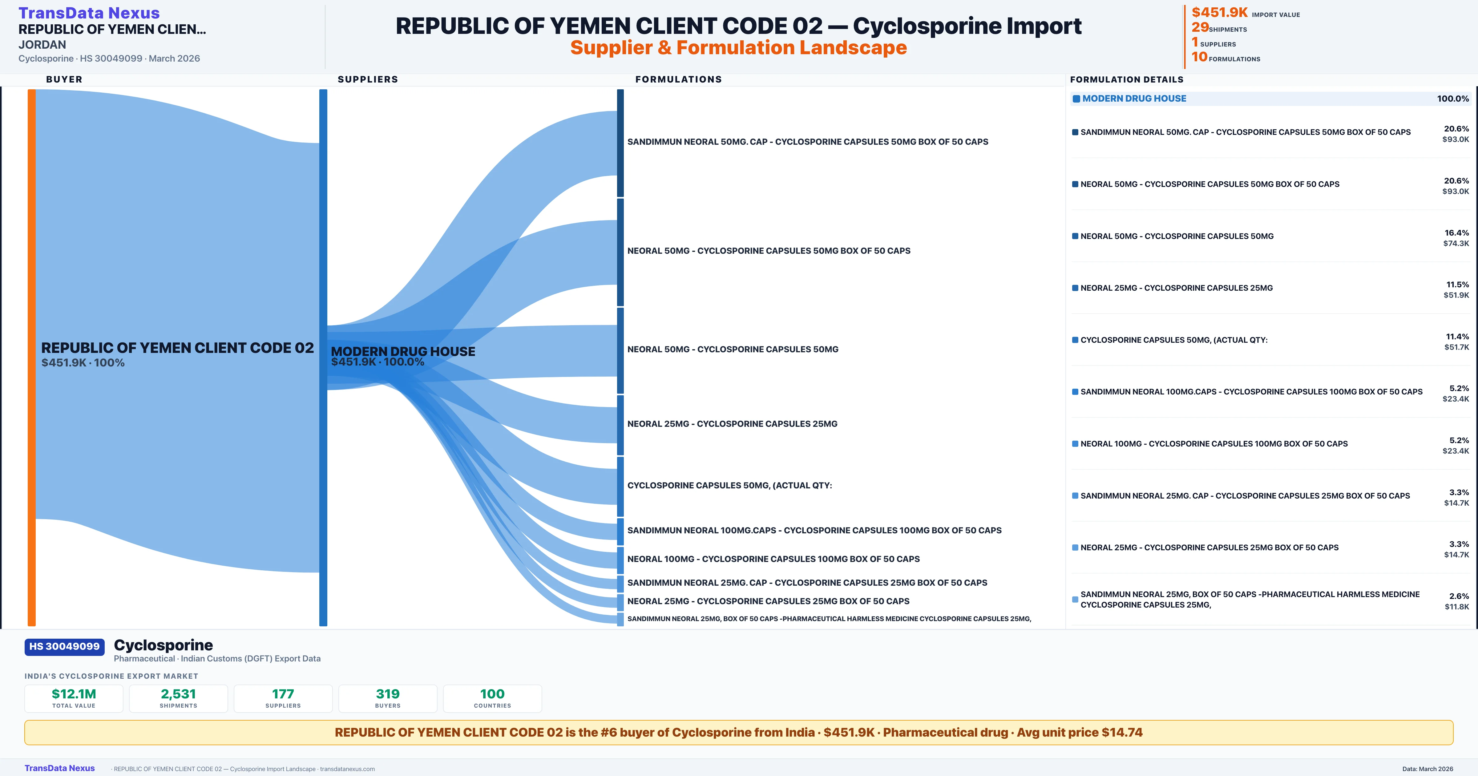 REPUBLIC OF YEMEN CLIENT CODE 02 sources Cyclosporine from 1 verified Indian supplier: MODERN DRUG HOUSE ($451.9K, 100.0%). This is based on 29 customs records.
